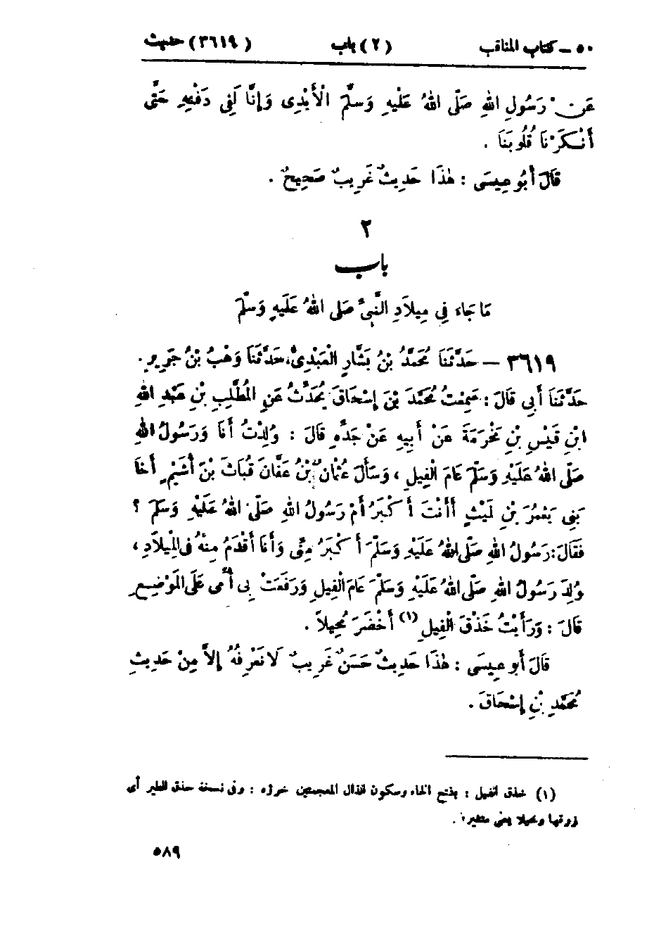 3619 - حَدَّثَنَا مُحَمَّدُ بْنُ بَشَّارٍ العَبْدِيُّ قَالَ: حَدَّثَنَا وَهْبُ بْنُ جَرِيرٍ قَالَ: حَدَّثَنَا أَبِي، قَالَ: سَمِعْتُ مُحَمَّدَ بْنَ إِسْحَاقَ، يُحَدِّثُ عَنْ المُطَّلِبِ بْنِ عَبْدِ اللَّهِ بْنِ قَيْسِ بْنِ مَخْرَمَةَ، عَنْ أَبِيهِ، عَنْ جَدِّهِ، قَالَ: «وُلِدْتُ أَنَا وَرَسُولُ اللَّهِ صَلَّى اللَّهُ عَلَيْهِ وَسَلَّمَ عَامَ الفِيلِ»، قَالَ: وَسَأَلَ عُثْمَانُ بْنُ عَفَّانَ قُبَاثَ بْنَ أَشْيَمَ أَخَا بَنِي يَعْمَرَ بْنِ لَيْثٍ: أَنْتَ أَكْبَرُ أَمْ رَسُولُ اللَّهِ صَلَّى اللَّهُ عَلَيْهِ وَسَلَّمَ؟ فَقَالَ: «§رَسُولُ اللَّهِ صَلَّى اللَّهُ عَلَيْهِ وَسَلَّمَ أَكْبَرُ مِنِّي وَأَنَا أَقْدَمُ مِنْهُ فِي المِيلَادِ»، قَالَ: «وَرَأَيْتُ خَذْقَ الْفِيلِ أَخْضَرَ مُحِيلًا». هَذَا حَدِيثٌ حَسَنٌ غَرِيبٌ لَا نَعْرِفُهُ إِلَّا مِنْ حَدِيثِ مُحَمَّدِ بْنِ إِسْحَاقَ