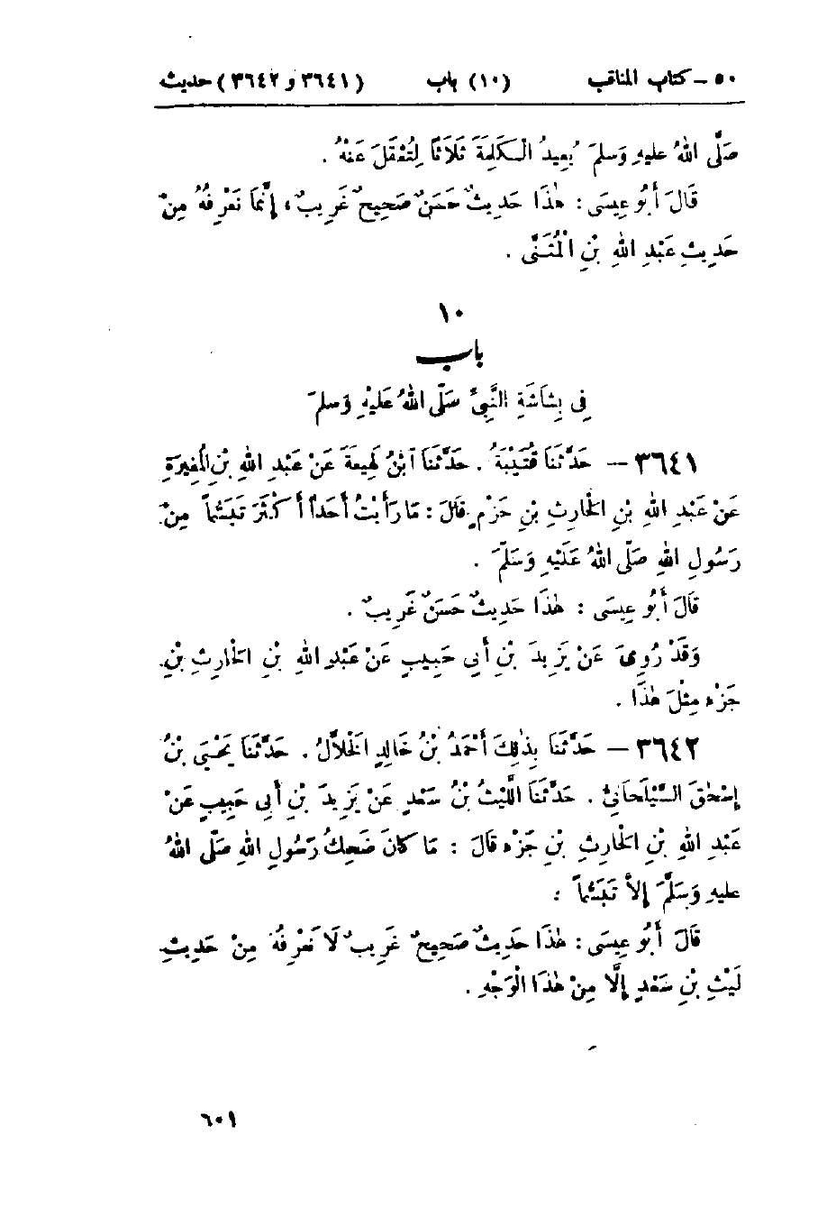 3642 - حَدَّثَنَا بِذَلِكَ أَحْمَدُ بْنُ خَالِدٍ الخَلَّالُ قَالَ: حَدَّثَنَا يَحْيَى بْنُ إِسْحَاقَ قَالَ: حَدَّثَنَا اللَّيْثُ بْنُ سَعْدٍ، عَنْ يَزِيدَ بْنِ أَبِي حَبِيبٍ، عَنْ عَبْدِ اللَّهِ بْنِ الحَارِثِ بْنِ جَزْءٍ، قَالَ: «§مَا كَانَ ضَحِكُ رَسُولِ اللَّهِ صَلَّى اللَّهُ عَلَيْهِ وَسَلَّمَ إِلَّا تَبَسُّمًا»: «هَذَا حَدِيثٌ صَحِيحٌ غَرِيبٌ لَا نَعْرِفُهُ مِنْ حَدِيثِ لَيْثِ بْنِ سَعْدٍ إِلَّا مِنْ هَذَا الوَجْهِ»