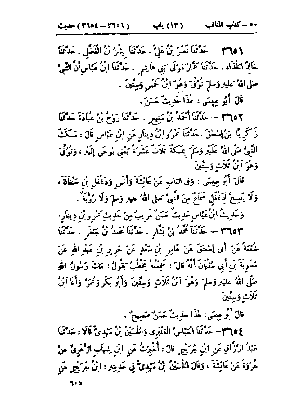 3651 - حَدَّثَنَا نَصْرُ بْنُ عَلِيٍّ الجَهْضَمِيُّ قَالَ: حَدَّثَنَا بِشْرُ بْنُ المُفَضَّلِ قَالَ: حَدَّثَنَا خَالِدٌ الحَذَّاءُ قَالَ: حَدَّثَنَا عَمَّارٌ، مَوْلَى بَنِي هَاشِمٍ قَالَ: حَدَّثَنَا ابْنُ عَبَّاسٍ، «أَنَّ النَّبِيَّ صَلَّى اللَّهُ عَلَيْهِ وَسَلَّمَ §تُوُفِّيَ وَهُوَ ابْنُ خَمْسٍ وَسِتِّينَ»: «هَذَا حَدِيثٌ حَسَنُ الإِسْنَادِ صَحِيحٌ»