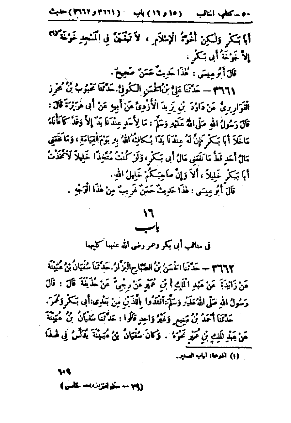 3662 - حَدَّثَنَا الحَسَنُ بْنُ الصَّبَّاحِ البَزَّارُ قَالَ: حَدَّثَنَا سُفْيَانُ بْنُ عُيَيْنَةَ، عَنْ زَائِدَةَ، عَنْ عَبْدِ المَلِكِ بْنِ عُمَيْرٍ، عَنْ رِبْعِيٍّ، عَنْ حُذَيْفَةَ، قَالَ: قَالَ رَسُولُ اللَّهِ صَلَّى اللَّهُ عَلَيْهِ وَسَلَّمَ: «§اقْتَدُوا بِاللَّذَيْنِ مِنْ بَعْدِي أَبِي بَكْرٍ، وَعُمَرَ». حَدَّثَنَا أَحْمَدُ بْنُ مَنِيعٍ، وَغَيْرُ وَاحِدٍ قَالُوا: حَدَّثَنَا سُفْيَانُ بْنُ عُيَيْنَةَ، عَنْ عَبْدِ المَلِكِ بْنِ عُمَيْرٍ، نَحْوَهُ. وَكَانَ سُفْيَانُ بْنُ عُيَيْنَةَ يُدَلِّسُ فِي هَذَا -[610]- الحَدِيثِ، فَرُبَّمَا ذَكَرَهُ عَنْ زَائِدَةَ، عَنْ عَبْدِ المَلِكِ بْنِ عُمَيْرٍ، وَرُبَّمَا لَمْ يَذْكُرْ فِيهِ عَنْ زَائِدَةَ. هَذَا حَدِيثٌ حَسَنٌ. وَفِيهِ عَنِ ابْنِ مَسْعُودٍ. وَرَوَى سُفْيَانُ الثَّوْرِيُّ، هَذَا الْحَدِيثَ، عَنْ عَبْدِ المَلِكِ بْنِ عُمَيْرٍ، عَنْ مَوْلًى لِرِبْعِيٍّ، عَنْ رِبْعِيٍّ، عَنْ حُذَيْفَةَ، عَنِ النَّبِيِّ صَلَّى اللَّهُ عَلَيْهِ وَسَلَّمَ وَرَوَى هَذَا الحَدِيثَ إِبْرَاهِيمُ بْنُ سَعْدٍ، عَنْ سُفْيَانَ الثَّوْرِيِّ، عَنْ عَبْدِ المَلِكِ بْنِ عُمَيْرٍ، عَنْ هِلَالٍ، مَوْلَى رِبْعِيٍّ، عَنْ رِبْعِيٍّ، عَنْ حُذَيْفَةَ، عَنِ النَّبِيِّ صَلَّى اللَّهُ عَلَيْهِ وَسَلَّمَ. وَقَدْ رُوِيَ هَذَا الْحَدِيثُ مِنْ غَيْرِ هَذَا الْوَجْهِ أَيْضًا، عَنْ رِبْعِيٍّ عَنْ حُذَيْفَةَ عَنِ النَّبِيِّ صَلَّى اللَّهُ عَلَيْهِ وَسَلَّمَ