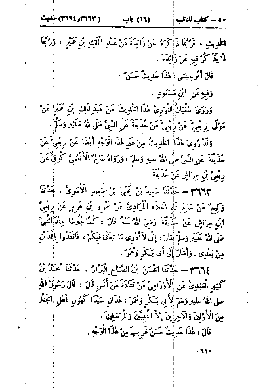 3663 - حَدَّثَنَا سَعِيدُ بْنُ يَحْيَى بْنُ سَعِيدٍ الأُمَوِيُّ قَالَ: حَدَّثَنَا وَكِيعٌ، عَنْ سَالِمٍ أَبِي العَلَاءِ المُرَادِيِّ، عَنْ عَمْرِو بْنِ هَرِمٍ، عَنْ رِبْعِيِّ بْنِ حِرَاشٍ، عَنْ حُذَيْفَةَ قَالَ: كُنَّا جُلُوسًا عِنْدَ النَّبِيِّ صَلَّى اللَّهُ عَلَيْهِ وَسَلَّمَ فَقَالَ: «§إِنِّي لَا أَدْرِي مَا بَقَائِي فِيكُمْ، فَاقْتَدُوا بِاللَّذَيْنِ مِنْ بَعْدِي» وَأَشَارَ إِلَى أَبِي بَكْرٍ وَعُمَرَ