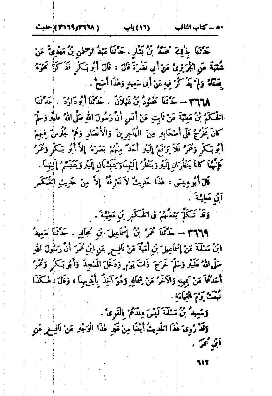 3668 - حَدَّثَنَا مَحْمُودُ بْنُ غَيْلَانَ قَالَ: حَدَّثَنَا أَبُو دَاوُدَ قَالَ: حَدَّثَنَا الحَكَمُ بْنُ عَطِيَّةَ، عَنْ ثَابِتٍ، عَنْ أَنَسٍ، أَنَّ رَسُولَ اللَّهِ صَلَّى اللَّهُ عَلَيْهِ وَسَلَّمَ «كَانَ §يَخْرُجُ عَلَى أَصْحَابِهِ مِنَ المُهَاجِرِينَ وَالأَنْصَارِ وَهُمْ جُلُوسٌ وَفِيهِمْ أَبُو بَكْرٍ وَعُمَرُ فَلَا يَرْفَعُ إِلَيْهِ أَحَدٌ مِنْهُمْ بَصَرَهُ إِلَّا أَبُو بَكْرٍ وَعُمَرُ فَإِنَّهُمَا كَانَا يَنْظُرَانِ إِلَيْهِ وَيَنْظُرُ إِلَيْهِمَا وَيَتَبَسَّمَانِ إِلَيْهِ وَيَتَبَسَّمُ إِلَيْهِمَا»: «هَذَا حَدِيثٌ غَرِيبٌ لَا نَعْرِفُهُ إِلَّا مِنْ حَدِيثِ الحَكَمِ بْنِ عَطِيَّةَ، وَقَدْ تَكَلَّمَ بَعْضُهُمْ فِي الحَكَمِ بْنِ عَطِيَّةَ»