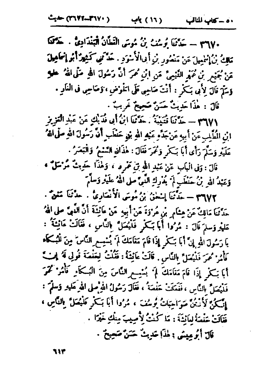 3672 - حَدَّثَنَا إِسْحَاقُ بْنُ مُوسَى الأَنْصَارِيُّ قَالَ: حَدَّثَنَا مَعْنٌ قَالَ: حَدَّثَنَا مَالِكٌ، عَنْ هِشَامِ بْنِ عُرْوَةَ، عَنْ أَبِيهِ، عَنْ عَائِشَةَ، أَنَّ النَّبِيَّ صَلَّى اللَّهُ عَلَيْهِ وَسَلَّمَ قَالَ: «مُرُوا أَبَا بَكْرٍ فَلْيُصَلِّ بِالنَّاسِ»، فَقَالَتْ عَائِشَةُ: يَا رَسُولَ اللَّهِ إِنَّ أَبَا بَكْرٍ إِذَا قَامَ مَقَامَكَ لَمْ يُسْمِعِ النَّاسَ مِنَ البُكَاءِ فَأْمُرْ عُمَرَ فَلْيُصَلِّ بِالنَّاسِ، قَالَتْ: فَقَالَ: «مُرُوا أَبَا بَكْرٍ فَلْيُصَلِّ بِالنَّاسِ» قَالَتْ عَائِشَةُ: فَقُلْتُ لِحَفْصَةَ: قُولِي لَهُ إِنَّ أَبَا بَكْرٍ إِذَا قَامَ مَقَامَكَ لَمْ يُسْمِعِ النَّاسَ مِنَ البُكَاءِ فَأْمُرْ عُمَرَ فَلْيُصَلِّ بِالنَّاسِ، فَفَعَلَتْ حَفْصَةُ، فَقَالَ رَسُولُ اللَّهِ صَلَّى اللَّهُ عَلَيْهِ وَسَلَّمَ: «§إِنَّكُنَّ لَأَنْتُنَّ صَوَاحِبُ يُوسُفَ، مُرُوا أَبَا بَكْرٍ فَلْيُصَلِّ بِالنَّاسِ»، فَقَالَتْ حَفْصَةُ لِعَائِشَةَ: مَا كُنْتُ لِأُصِيبَ مِنْكِ خَيْرًا: «هَذَا حَدِيثٌ حَسَنٌ صَحِيحٌ» -[614]- وَفِي البَابِ عَنْ عَبْدِ اللَّهِ بْنِ مَسْعُودٍ، وَأَبِي مُوسَى، وَابْنِ عَبَّاسٍ، وَسَالِمِ بْنِ عُبَيْدٍ