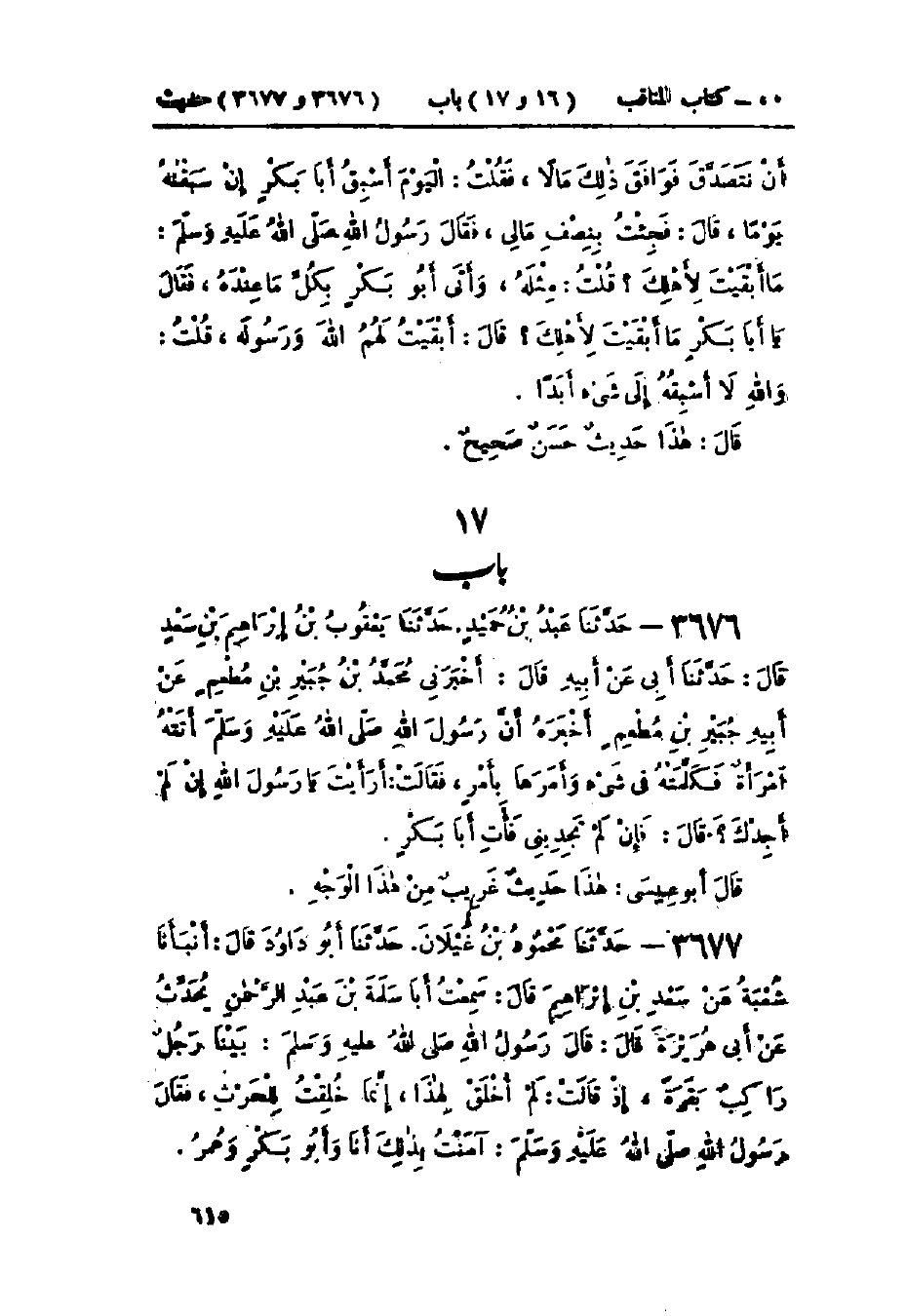 3676 - حَدَّثَنَا عَبْدُ بْنُ حُمَيْدٍ قَالَ: حَدَّثَنَا يَعْقُوبُ بْنُ إِبْرَاهِيمَ بْنِ سَعْدٍ، قَالَ: حَدَّثَنَا أَبِي، عَنْ أَبِيهِ، قَالَ: أَخْبَرَنِي مُحَمَّدُ بْنُ جُبَيْرِ بْنِ مُطْعِمٍ، أَنَّ أَبَاهُ جُبَيْرَ بْنَ مُطْعِمٍ أَخْبَرَهُ، أَنَّ امْرَأَةً أَتَتْ رَسُولَ اللَّهِ صَلَّى اللَّهُ عَلَيْهِ وَسَلَّمَ فَكَلَّمَتْهُ فِي شَيْءٍ فَأَمَرَهَا بِأَمْرٍ، فَقَالَتْ: أَرَأَيْتَ يَا رَسُولَ اللَّهِ إِنْ لَمْ أَجِدْكَ؟ قَالَ: «§إِنْ لَمْ تَجِدِينِي فَائْتِي أَبَا بَكْرٍ». هَذَا حَدِيثٌ صَحِيحٌ