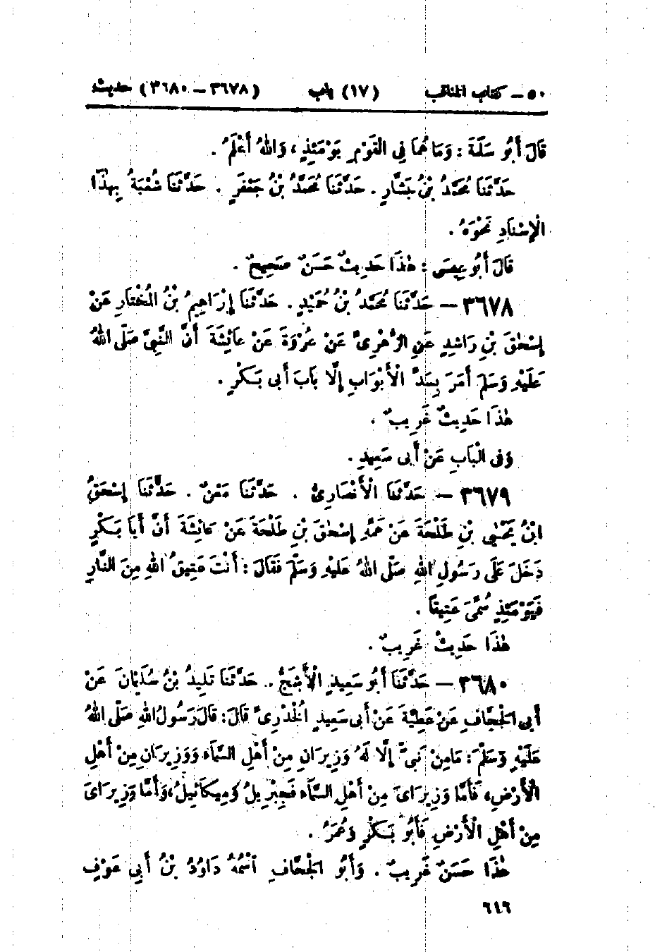 3678 - حَدَّثَنَا مُحَمَّدُ بْنُ حُمَيْدٍ قَالَ: حَدَّثَنَا إِبْرَاهِيمُ بْنُ المُخْتَارِ، عَنْ إِسْحَاقَ بْنِ رَاشِدٍ، عَنْ الزُّهْرِيِّ، عَنْ عُرْوَةَ، عَنْ عَائِشَةَ، أَنَّ النَّبِيَّ صَلَّى اللَّهُ عَلَيْهِ وَسَلَّمَ: «§أَمَرَ بِسَدِّ الأَبْوَابِ إِلَّا بَابَ أَبِي بَكْرٍ» هَذَا حَدِيثٌ غَرِيبٌ مِنْ هَذَا الوَجْهِ " وَفِي البَابِ عَنْ أَبِي سَعِيدٍ