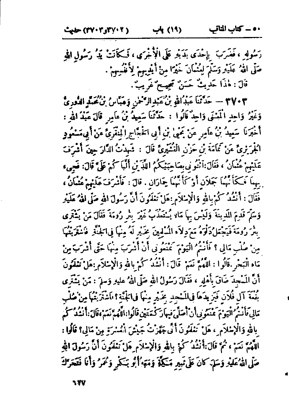 3703 - حَدَّثَنَا عَبْدُ اللَّهِ بْنُ عَبْدِ الرَّحْمَنِ، وَعَبَّاسُ بْنُ مُحَمَّدٍ الدُّورِيُّ، وَغَيْرُ وَاحِدٍ المَعْنَى وَاحِدٌ، قَالُوا: حَدَّثَنَا سَعِيدُ بْنُ عَامِرٍ، قَالَ: عَبْدُ اللَّهِ، أَخْبَرَنَا سَعِيدُ بْنُ عَامِرٍ، عَنْ يَحْيَى بْنِ أَبِي الحَجَّاجِ المَنْقَرِيِّ، عَنْ أَبِي مَسْعُودٍ الجُرَيْرِيِّ، عَنْ ثُمَامَةَ بْنِ حَزْنٍ القُشَيْرِيِّ، قَالَ: شَهِدْتُ الدَّارَ حِينَ أَشْرَفَ عَلَيْهِمْ عُثْمَانُ، فَقَالَ: ائْتُونِي بِصَاحِبَيْكُمُ اللَّذَيْنِ أَلَّبَاكُمْ عَلَيَّ. قَالَ: فَجِيءَ بِهِمَا فَكَأَنَّهُمَا جَمَلَانِ أَوْ كَأَنَّهُمَا حِمَارَانِ، قَالَ: فَأَشْرَفَ عَلَيْهِمْ عُثْمَانُ، فَقَالَ: أَنْشُدُكُمْ بِاللَّهِ وَالإِسْلَامِ هَلْ تَعْلَمُونَ أَنَّ رَسُولَ اللَّهِ صَلَّى اللَّهُ عَلَيْهِ وَسَلَّمَ قَدِمَ المَدِينَةَ وَلَيْسَ بِهَا مَاءٌ يُسْتَعْذَبُ غَيْرَ بِئْرِ رُومَةَ فَقَالَ رَسُولُ اللَّهِ صَلَّى اللَّهُ عَلَيْهِ وَسَلَّمَ: «§مَنْ يَشْتَرِي بِئْرَ رُومَةَ فَيَجْعَلَ دَلْوَهُ مَعَ دِلَاءِ المُسْلِمِينَ بِخَيْرٍ لَهُ مِنْهَا فِي الْجَنَّةِ»؟ فَاشْتَرَيْتُهَا مِنْ صُلْبِ مَالِي فَأَنْتُمُ اليَوْمَ تَمْنَعُونِي أَنْ أَشْرَبَ مِنْهَا حَتَّى أَشْرَبَ مِنْ مَاءِ الْبَحْرِ. قَالُوا: اللَّهُمَّ نَعَمْ. فَقَالَ: أَنْشُدُكُمْ بِاللَّهِ وَالْإِسْلَامِ هَلْ تَعْلَمُونَ أَنَّ المَسْجِدَ ضَاقَ بِأَهْلِهِ، فَقَالَ رَسُولُ اللَّهِ صَلَّى اللَّهُ عَلَيْهِ وَسَلَّمَ: «مَنْ يَشْتَرِي بُقْعَةَ آلِ فُلَانٍ فَيَزِيدَهَا فِي المَسْجِدِ بِخَيْرٍ لَهُ مِنْهَا فِي الجَنَّةِ»؟ فَاشْتَرَيْتُهَا مِنْ صُلْبِ مَالِي فَأَنْتُمُ اليَوْمَ تَمْنَعُونِي أَنْ أُصَلِّيَ فِيهَا رَكْعَتَيْنِ؟ قَالُوا: اللَّهُمَّ، نَعَمْ. قَالَ: أَنْشُدُكُمْ بِاللَّهِ وَبِالْإِسْلَامِ، هَلْ تَعْلَمُونَ أَنِّي جَهَّزْتُ جَيْشَ العُسْرَةِ مِنْ مَالِي؟ قَالُوا: اللَّهُمَّ نَعَمْ. ثُمَّ قَالَ: أَنْشُدُكُمْ بِاللَّهِ وَالإِسْلَامِ هَلْ تَعْلَمُونَ أَنَّ رَسُولَ اللَّهِ صَلَّى اللَّهُ عَلَيْهِ وَسَلَّمَ كَانَ عَلَى ثَبِيرِ مَكَّةَ وَمَعَهُ أَبُو بَكْرٍ وَعُمَرُ وَأَنَا فَتَحَرَّكَ -[628]- الجَبَلُ حَتَّى تَسَاقَطَتْ حِجَارَتُهُ بِالحَضِيضِ قَالَ: فَرَكَضَهُ بِرِجْلِهِ وَقَالَ: «اسْكُنْ ثَبِيرُ فَإِنَّمَا عَلَيْكَ نَبِيٌّ وَصِدِّيقٌ وَشَهِيدَانِ؟» قَالُوا: اللَّهُمَّ، نَعَمْ. قَالَ: اللَّهُ أَكْبَرُ شَهِدُوا لِي وَرَبِّ الكَعْبَةِ أَنِّي شَهِيدٌ، ثَلَاثًا: «هَذَا حَدِيثٌ حَسَنٌ وَقَدْ رُوِيَ مِنْ غَيْرِ وَجْهٍ عَنْ عُثْمَانَ»