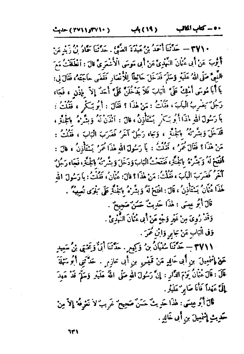 3710 - حَدَّثَنَا أَحْمَدُ بْنُ عَبْدَةَ الضَّبِّيُّ قَالَ: حَدَّثَنَا حَمَّادُ بْنُ زَيْدٍ، عَنْ أَيُّوبَ، عَنْ أَبِي عُثْمَانَ النَّهْدِيِّ، عَنْ أَبِي مُوسَى الأَشْعَرِيِّ، قَالَ: انْطَلَقْتُ مَعَ النَّبِيِّ صَلَّى اللَّهُ عَلَيْهِ وَسَلَّمَ فَدَخَلَ حَائِطًا لِلأَنْصَارِ فَقَضَى حَاجَتَهُ، فَقَالَ لِي: «يَا أَبَا مُوسَى أَمْلِكْ عَلَيَّ البَابَ فَلَا يَدْخُلَنَّ عَلَيَّ أَحَدٌ إِلَّا بِإِذْنٍ». فَجَاءَ رَجُلٌ فَضَرَبَ الْبَابَ، فَقُلْتُ: مَنْ هَذَا؟ فَقَالَ: أَبُو بَكْرٍ، فَقُلْتُ: يَا رَسُولَ اللَّهِ هَذَا أَبُو بَكْرٍ يَسْتَأْذِنُ، قَالَ: «§ائْذَنْ لَهُ وَبَشِّرْهُ بِالجَنَّةِ». فَدَخَلَ وَبَشَّرْتُهُ بِالجَنَّةِ، وَجَاءَ رَجُلٌ آخَرُ فَضَرَبَ البَابَ، فَقُلْتُ: مَنْ هَذَا؟ فَقَالَ: عُمَرُ، فَقُلْتُ: يَا رَسُولَ اللَّهِ هَذَا عُمَرُ يَسْتَأْذِنُ، قَالَ: «افْتَحْ لَهُ وَبَشِّرْهُ بِالجَنَّةِ». فَفَتَحْتُ البَابَ وَدَخَلَ وَبَشَّرْتُهُ بِالجَنَّةِ، فَجَاءَ رَجُلٌ آخَرُ فَضَرَبَ البَابَ، فَقُلْتُ: مَنْ هَذَا؟ قَالَ: عُثْمَانُ، فَقُلْتُ: يَا رَسُولَ اللَّهِ هَذَا عُثْمَانُ يَسْتَأْذِنُ، قَالَ: «افْتَحْ لَهُ وَبَشِّرْهُ بِالجَنَّةِ عَلَى بَلْوَى تُصِيبُهُ»: «هَذَا حَدِيثٌ حَسَنٌ صَحِيحٌ»، وَقَدْ رُوِيَ مِنْ غَيْرِ وَجْهٍ عَنْ أَبِي عُثْمَانَ النَّهْدِيِّ وَفِي البَابِ عَنْ جَابِرٍ، وَابْنِ عُمَرَ