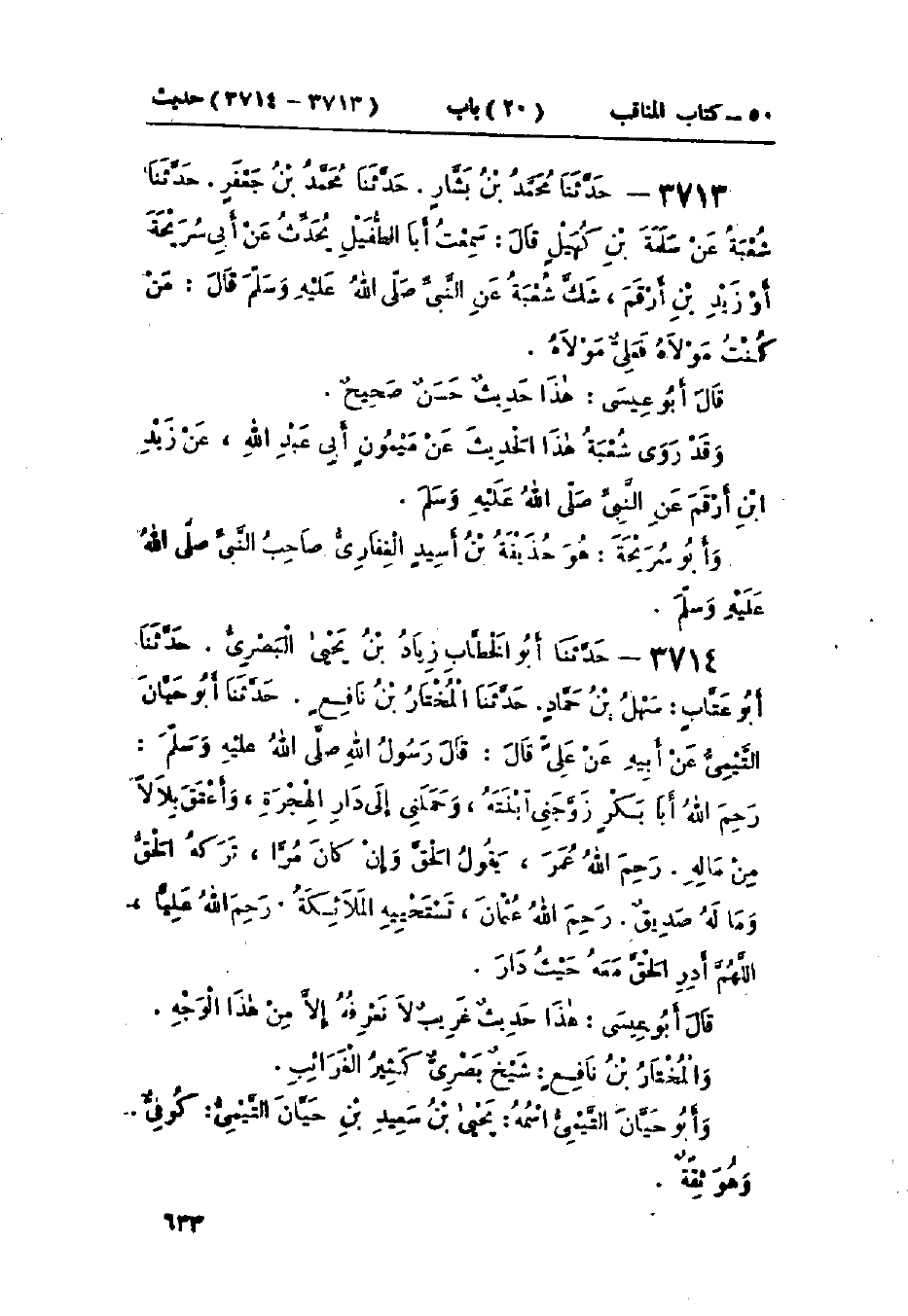 3713 - حَدَّثَنَا مُحَمَّدُ بْنُ بَشَّارٍ قَالَ: حَدَّثَنَا مُحَمَّدُ بْنُ جَعْفَرٍ قَالَ: حَدَّثَنَا شُعْبَةُ، عَنْ سَلَمَةَ بْنِ كُهَيْلٍ، قَالَ: سَمِعْتُ أَبَا الطُّفَيْلِ يُحَدِّثُ، عَنْ أَبِي سَرِيحَةَ، أَوْ زَيْدِ بْنِ أَرْقَمَ - شَكَّ شُعْبَةُ - عَنِ النَّبِيِّ صَلَّى اللَّهُ عَلَيْهِ وَسَلَّمَ قَالَ: «§مَنْ كُنْتُ مَوْلَاهُ فَعَلِيٌّ مَوْلَاهُ»: «هَذَا حَدِيثٌ حَسَنٌ غَرِيبٌ»، وَقَدْ رَوَى شُعْبَةُ، هَذَا الحَدِيثَ، عَنْ مَيْمُونٍ أَبِي عَبْدِ اللَّهِ، عَنْ زَيْدِ بْنِ أَرْقَمَ، عَنِ النَّبِيِّ صَلَّى اللَّهُ عَلَيْهِ وَسَلَّمَ نَحْوَهُ. وَأَبُو سَرِيحَةَ هُوَ: حُذَيْفَةُ بْنُ أَسِيدٍ صَاحِبُ النَّبِيِّ صَلَّى اللَّهُ عَلَيْهِ وَسَلَّمَ