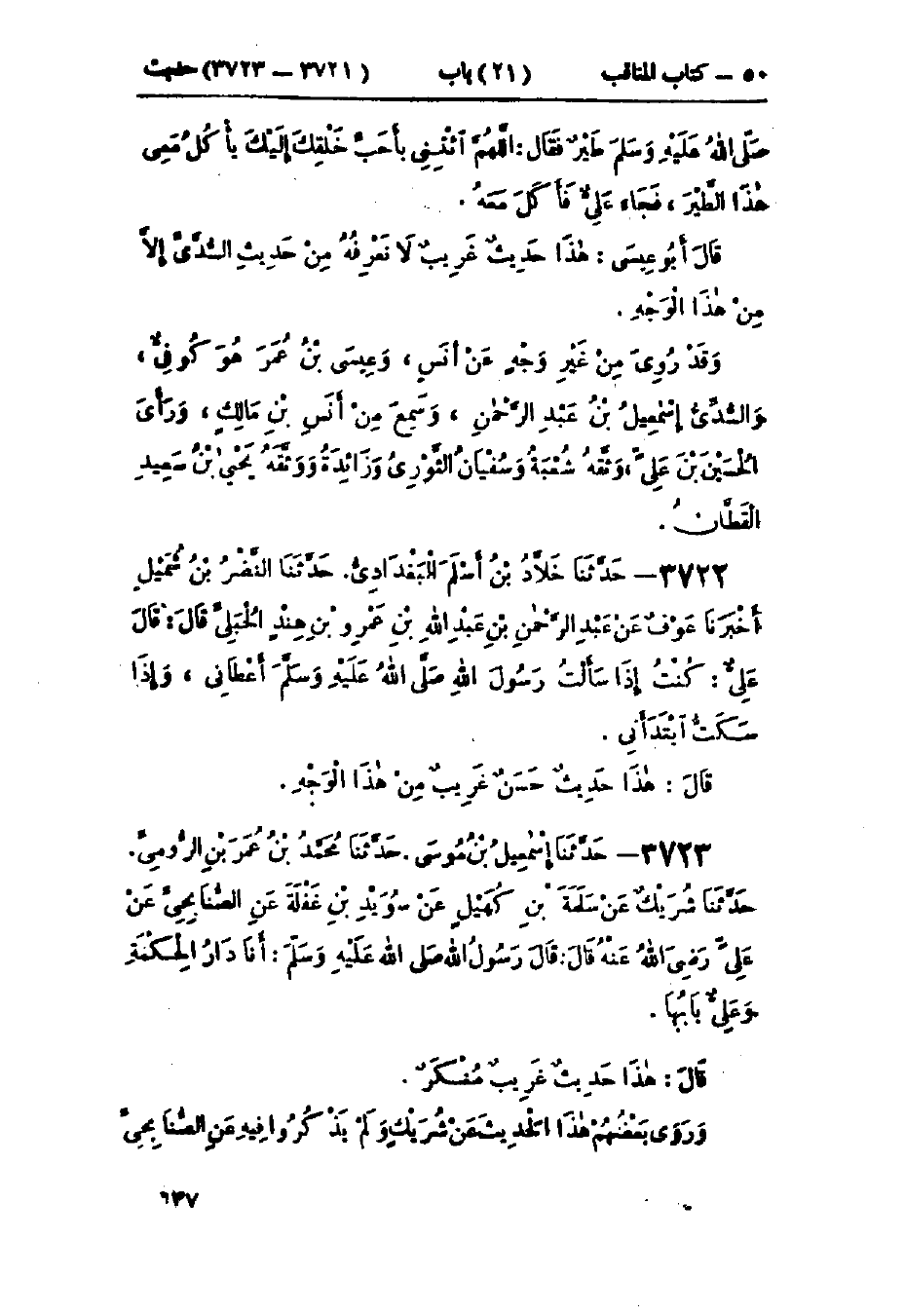 3722 - حَدَّثَنَا خَلَّادُ بْنُ أَسْلَمَ البَغْدَادِيُّ قَالَ: حَدَّثَنَا النَّضْرُ بْنُ شُمَيْلٍ قَالَ: أَخْبَرَنَا عَوْفٌ، عَنْ عَبْدِ اللَّهِ بْنِ عَمْرِو بْنِ هِنْدٍ الحُبَلِيِّ، قَالَ: قَالَ عَلِيٌّ: «§كُنْتُ إِذَا سَأَلْتُ رَسُولَ اللَّهِ صَلَّى اللَّهُ عَلَيْهِ وَسَلَّمَ أَعْطَانِي، وَإِذَا سَكَتُّ ابْتَدَأَنِي»: " هَذَا حَدِيثٌ حَسَنٌ غَرِيبٌ مِنْ هَذَا الوَجْهِ
