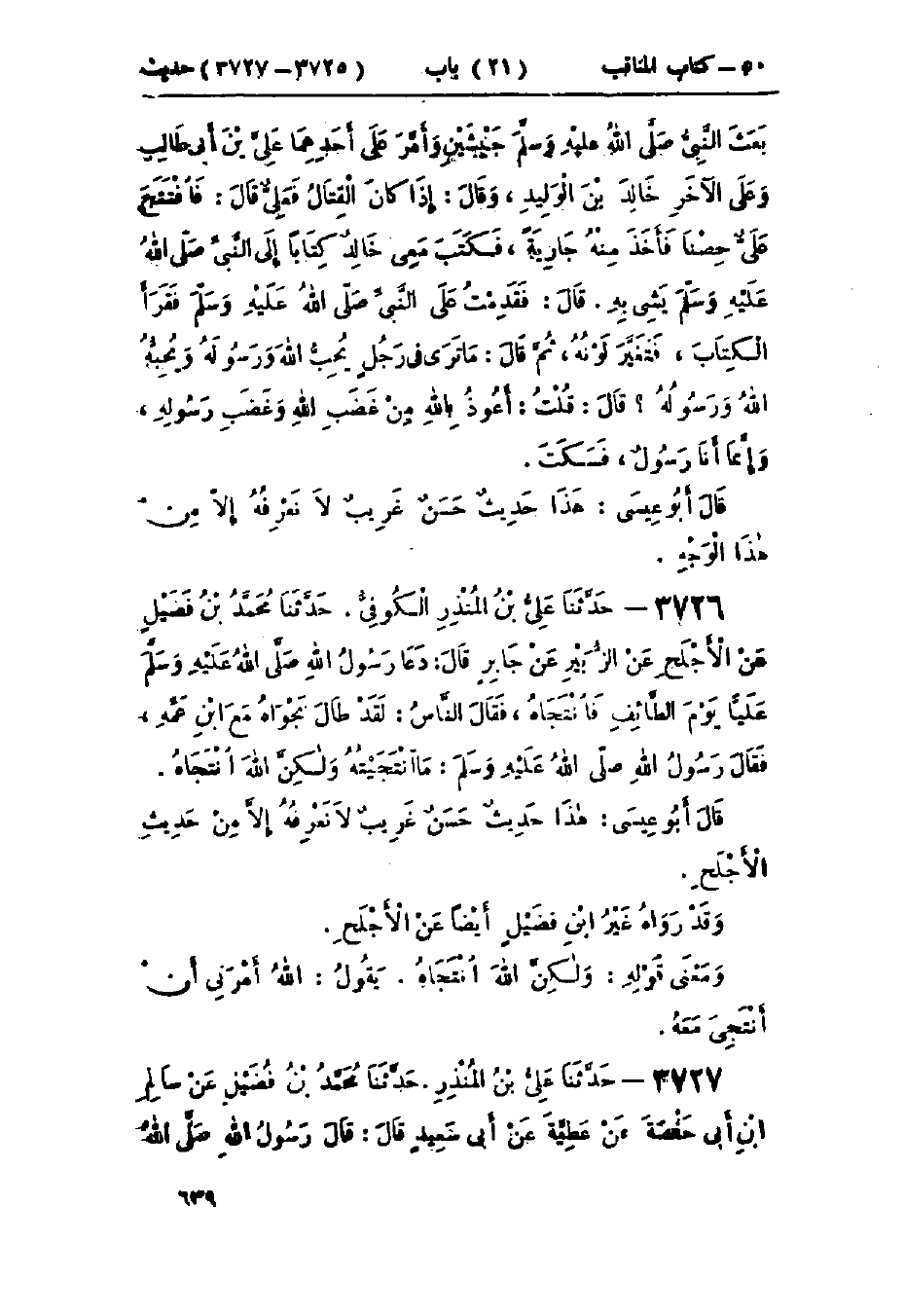 3726 - حَدَّثَنَا عَلِيُّ بْنُ المُنْذِرِ الكُوفِيُّ قَالَ: حَدَّثَنَا مُحَمَّدُ بْنُ فُضَيْلٍ، عَنْ الأَجْلَحِ، عَنْ أَبِي الزُّبَيْرِ، عَنْ جَابِرٍ، قَالَ: دَعَا رَسُولُ اللَّهِ صَلَّى اللَّهُ عَلَيْهِ وَسَلَّمَ عَلِيًّا يَوْمَ الطَّائِفِ فَانْتَجَاهُ، فَقَالَ النَّاسُ: لَقَدْ طَالَ نَجْوَاهُ مَعَ ابْنِ عَمِّهِ، فَقَالَ رَسُولُ اللَّهِ صَلَّى اللَّهُ عَلَيْهِ وَسَلَّمَ: «§مَا انْتَجَيْتُهُ وَلَكِنَّ اللَّهَ انْتَجَاهُ». هَذَا حَدِيثٌ حَسَنٌ غَرِيبٌ لَا نَعْرِفُهُ إِلَّا مِنْ حَدِيثِ الأَجْلَحِ. وَقَدْ رَوَاهُ غَيْرُ ابْنِ فُضَيْلٍ، أَيْضًا عَنِ الأَجْلَحِ، وَمَعْنَى قَوْلِهِ: «وَلَكِنَّ اللَّهَ انْتَجَاهُ». يَقُولُ: إِنَّ اللَّهَ أَمَرَنِي أَنْ أَنْتَجِيَ مَعَهُ