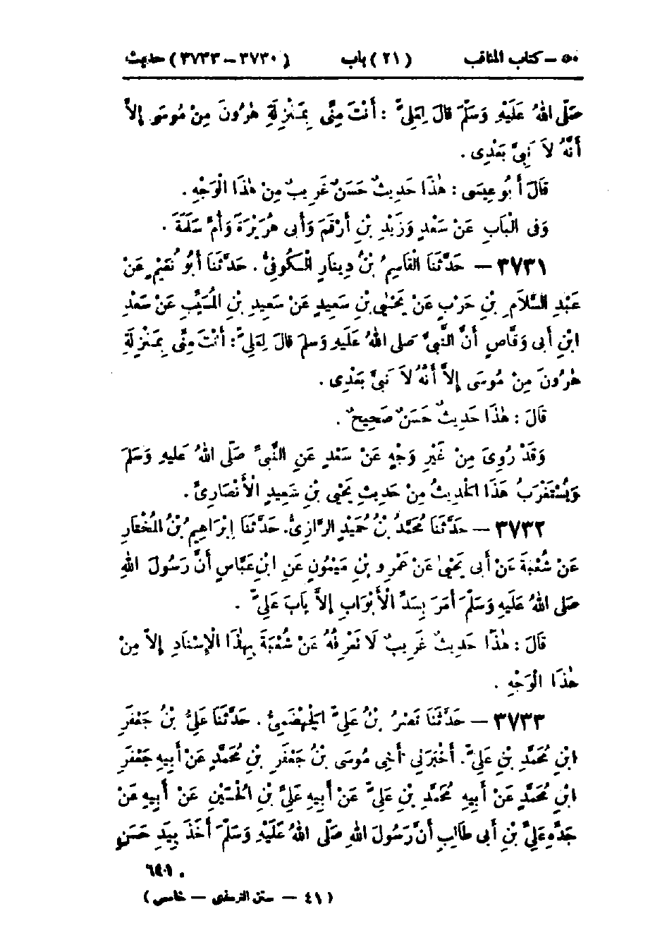 3731 - حَدَّثَنَا القَاسِمُ بْنُ دِينَارٍ الكُوفِيُّ قَالَ: حَدَّثَنَا أَبُو نُعَيْمٍ، عَنْ عَبْدِ السَّلَامِ بْنِ حَرْبٍ، عَنْ يَحْيَى بْنِ سَعِيدٍ، عَنْ سَعِيدِ بْنِ المُسَيِّبِ، عَنْ سَعْدِ بْنِ أَبِي وَقَّاصٍ، أَنَّ النَّبِيَّ صَلَّى اللَّهُ عَلَيْهِ وَسَلَّمَ قَالَ لِعَلِيٍّ: «§أَنْتَ مِنِّي بِمَنْزِلَةِ هَارُونَ مِنْ مُوسَى إِلَّا أَنَّهُ لَا نَبِيَّ بَعْدِي»: «هَذَا حَدِيثٌ حَسَنٌ صَحِيحٌ وَقَدْ رُوِيَ مِنْ غَيْرِ وَجْهٍ عَنْ سَعْدٍ، عَنِ النَّبِيِّ صَلَّى اللَّهُ عَلَيْهِ وَسَلَّمَ» وَيُسْتَغْرَبُ هَذَا الحَدِيثُ مِنْ حَدِيثِ يَحْيَى بْنِ سَعِيدٍ الأَنْصَارِيِّ