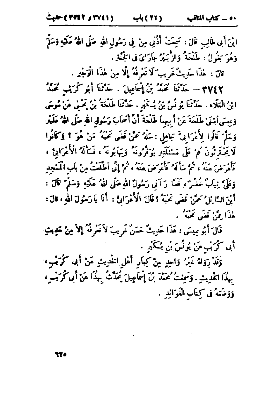 3742 - حَدَّثَنَا أَبُو كُرَيْبٍ مُحَمَّدُ بْنُ العَلَاءِ قَالَ: حَدَّثَنَا يُونُسُ بْنُ بُكَيْرٍ قَالَ: حَدَّثَنَا طَلْحَةُ بْنُ يَحْيَى، عَنْ مُوسَى، وَعِيسَى ابْنَيْ طَلْحَةَ، عَنْ أَبِيهِمَا طَلْحَةَ، أَنَّ أَصْحَابَ رَسُولِ اللَّهِ صَلَّى اللَّهُ عَلَيْهِ وَسَلَّمَ قَالُوا: لِأَعْرَابِيٍّ جَاهِلٍ: سَلْهُ عَمَّنْ قَضَى نَحْبَهُ مَنْ هُوَ؟ وَكَانُوا لَا يَجْتَرِئُونَ عَلَى مَسْأَلَتِهِ يُوَقِّرُونَهُ وَيَهَابُونَهُ، فَسَأَلَهُ الْأَعْرَابِيُّ، فَأَعْرَضَ عَنْهُ، ثُمَّ سَأَلَهُ فَأَعْرَضَ عَنْهُ، ثُمَّ سَأَلَهُ فَأَعْرَضَ عَنْهُ، ثُمَّ إِنِّي اطَّلَعْتُ مِنْ بَابِ المَسْجِدِ وَعَلَيَّ ثِيَابٌ خُضْرٌ، فَلَمَّا رَآنِي رَسُولُ اللَّهِ صَلَّى اللَّهُ عَلَيْهِ وَسَلَّمَ قَالَ: «§أَيْنَ السَّائِلُ عَمَّنْ قَضَى نَحْبَهُ»؟ قَالَ الأَعْرَابِيُّ: أَنَا يَا رَسُولَ اللَّهِ، قَالَ: «هَذَا مِمَّنْ قَضَى نَحْبَهُ»: " هَذَا حَدِيثٌ حَسَنٌ غَرِيبٌ لَا نَعْرِفُهُ إِلَّا مِنْ حَدِيثِ أَبِي كُرَيْبٍ، عَنْ يُونُسَ بْنِ بُكَيْرٍ وَقَدْ رَوَاهُ غَيْرُ وَاحِدٍ مِنْ كِبَارِ أَهْلِ الحَدِيثِ عَنْ أَبِي كُرَيْبٍ، بِهَذَا الْحَدِيثِ. وسَمِعْت مُحَمَّدَ بْنَ إِسْمَاعِيلَ، يُحَدِّثُ بِهَذَا عَنْ أَبِي كُرَيْبٍ، وَوَضَعَهُ فِي كِتَابِ الفَوَائِدِ