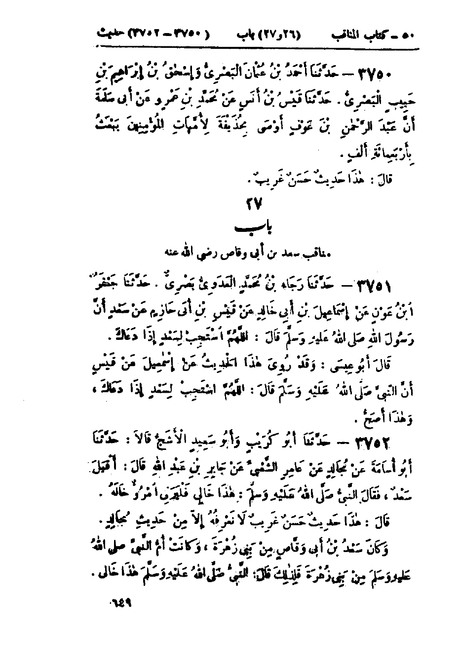 3752 - حَدَّثَنَا أَبُو كُرَيْبٍ، وَأَبُو سَعِيدٍ الأَشَجُّ، قَالَا: حَدَّثَنَا أَبُو أُسَامَةَ، عَنْ مُجَالِدٍ، عَنْ عَامِرٍ الشَّعْبِيِّ، عَنْ جَابِرِ بْنِ عَبْدِ اللَّهِ، قَالَ: أَقْبَلَ سَعْدٌ، فَقَالَ النَّبِيُّ صَلَّى اللَّهُ عَلَيْهِ وَسَلَّمَ: «§هَذَا خَالِي فَلْيُرِنِي امْرُؤٌ خَالَهُ». هَذَا حَدِيثٌ غَرِيبٌ لَا نَعْرِفُهُ إِلَّا مِنْ حَدِيثِ مُجَالِدٍ. وَكَانَ سَعْدُ بْنُ أَبِي وَقَّاصٍ مِنْ بَنِي زُهْرَةَ، وَكَانَتْ أُمُّ النَّبِيِّ صَلَّى اللَّهُ عَلَيْهِ وَسَلَّمَ مِنْ بَنِي زُهْرَةَ فَلِذَلِكَ قَالَ النَّبِيُّ صَلَّى اللَّهُ عَلَيْهِ وَسَلَّمَ هَذَا خَالِي