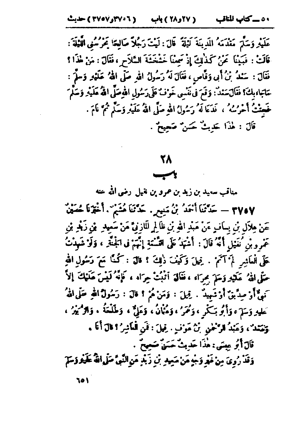 3757 - حَدَّثَنَا أَحْمَدُ بْنُ مَنِيعٍ قَالَ: حَدَّثَنَا هُشَيْمٌ قَالَ: أَخْبَرَنَا حُصَيْنٌ، عَنْ هِلَالِ بْنِ يَسَافٍ، عَنْ عَبْدِ اللَّهِ بْنِ ظَالِمٍ المَازِنِيِّ، عَنْ سَعِيدِ بْنِ زَيْدِ بْنِ عَمْرِو بْنِ نُفَيْلٍ، أَنَّهُ قَالَ: أَشْهَدُ عَلَى التِّسْعَةِ أَنَّهُمْ فِي الجَنَّةِ، وَلَوْ شَهِدْتُ عَلَى العَاشِرِ لَمْ آثَمْ. قِيلَ: وَكَيْفَ ذَاكَ؟ قَالَ: كُنَّا مَعَ رَسُولِ اللَّهِ صَلَّى اللَّهُ عَلَيْهِ وَسَلَّمَ بِحِرَاءَ، فَقَالَ: «§اثْبُتْ حِرَاءُ، فَإِنَّهُ لَيْسَ عَلَيْكَ إِلَّا نَبِيٌّ أَوْ صِدِّيقٌ أَوْ شَهِيدٌ». قِيلَ: وَمَنْ هُمْ؟ قَالَ رَسُولُ اللَّهِ صَلَّى اللَّهُ عَلَيْهِ وَسَلَّمَ، وَأَبُو بَكْرٍ، وَعُمَرُ، وَعُثْمَانُ، وَعَلِيٌّ، وَطَلْحَةُ، وَالزُّبَيْرُ، وَسَعْدٌ، وَعَبْدُ الرَّحْمَنِ بْنُ عَوْفٍ. قِيلَ فَمَنِ العَاشِرُ؟ قَالَ: أَنَا: «هَذَا حَدِيثٌ حَسَنٌ صَحِيحٌ» وَقَدْ رُوِيَ مِنْ غَيْرِ وَجْهٍ عَنْ سَعِيدِ بْنِ زَيْدٍ عَنِ النَّبِيِّ صَلَّى اللَّهُ عَلَيْهِ وَسَلَّمَ " -[652]- حَدَّثَنَا أَحْمَدُ بْنُ مَنِيعٍ قَالَ: حَدَّثَنَا الحَجَّاجُ بْنُ مُحَمَّدٍ قَالَ: حَدَّثَنِي شُعْبَةُ، عَنِ الحُرِّ بْنِ الصَّيَّاحِ، عَنْ عَبْدِ الرَّحْمَنِ بْنِ الأَخْنَسِ، عَنْ سَعِيدِ بْنِ زَيْدٍ، عَنِ النَّبِيِّ صَلَّى اللَّهُ عَلَيْهِ وَسَلَّمَ نَحْوَهُ بِمَعْنَاهُ. هَذَا حَدِيثٌ حَسَنٌ