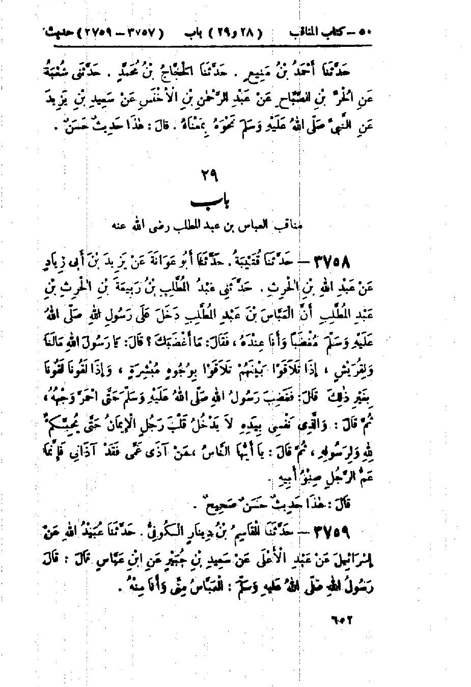3758 - حَدَّثَنَا قُتَيْبَةُ قَالَ: حَدَّثَنَا أَبُو عَوَانَةَ، عَنْ يَزِيدَ بْنِ أَبِي زِيَادٍ، عَنْ عَبْدِ اللَّهِ بْنِ الْحَارِثِ قَالَ: حَدَّثَنِي عَبْدُ المُطَّلِبِ بْنُ رَبِيعَةَ بْنِ الحَارِثِ بْنِ عَبْدِ المُطَّلِبِ، أَنَّ العَبَّاسَ بْنَ عَبْدِ المُطَّلِبِ، دَخَلَ عَلَى رَسُولِ اللَّهِ صَلَّى اللَّهُ عَلَيْهِ وَسَلَّمَ مُغْضَبًا وَأَنَا عِنْدَهُ، فَقَالَ: «مَا أَغْضَبَكَ»؟ قَالَ: يَا رَسُولَ اللَّهِ مَا لَنَا وَلِقُرَيْشٍ، إِذَا تَلَاقَوْا بَيْنَهُمْ تَلَاقَوْا بِوُجُوهٍ مُبْشَرَةٍ، وَإِذَا لَقُونَا لَقُونَا بِغَيْرِ ذَلِكَ، قَالَ: فَغَضِبَ رَسُولُ اللَّهِ صَلَّى اللَّهُ عَلَيْهِ وَسَلَّمَ حَتَّى احْمَرَّ وَجْهُهُ، ثُمَّ قَالَ: «وَالَّذِي نَفْسِي بِيَدِهِ §لَا يَدْخُلُ قَلْبَ رَجُلٍ الإِيمَانُ حَتَّى يُحِبَّكُمْ لِلَّهِ وَلِرَسُولِهِ»، ثُمَّ قَالَ: «يَا أَيُّهَا النَّاسُ مَنْ آذَى عَمِّي فَقَدْ آذَانِي فَإِنَّمَا عَمُّ الرَّجُلِ صِنْوُ أَبِيهِ». هَذَا حَدِيثٌ حَسَنٌ صَحِيحٌ