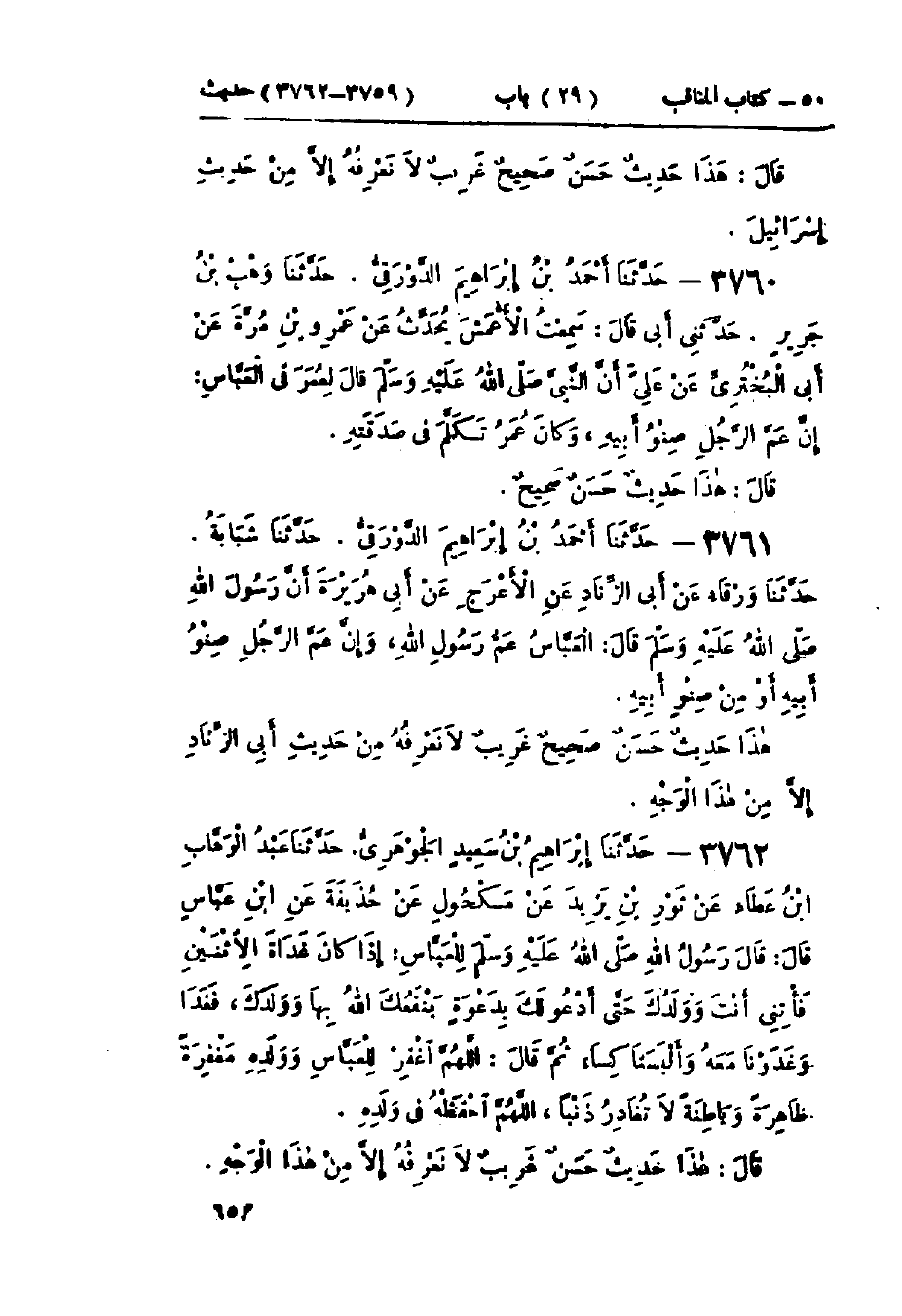 3762 - حَدَّثَنَا إِبْرَاهِيمُ بْنُ سَعِيدٍ الجَوْهَرِيُّ قَالَ: حَدَّثَنَا عَبْدُ الوَهَّابِ بْنُ عَطَاءٍ، عَنْ ثَوْرِ بْنِ يَزِيدَ، عَنْ مَكْحُولٍ، عَنْ كُرَيْبٍ، عَنْ ابْنِ عَبَّاسٍ، قَالَ: قَالَ رَسُولُ اللَّهِ صَلَّى اللَّهُ عَلَيْهِ وَسَلَّمَ لِلْعَبَّاسِ: «§إِذَا كَانَ غَدَاةَ الِاثْنَيْنِ فَأْتِنِي أَنْتَ وَوَلَدُكَ حَتَّى أَدْعُوَ لَهُمْ بِدَعْوَةٍ يَنْفَعُكَ اللَّهُ بِهَا وَوَلَدَكَ»، فَغَدَا وَغَدَوْنَا مَعَهُ فَأَلْبَسَنَا كِسَاءً ثُمَّ قَالَ: «اللَّهُمَّ اغْفِرْ لِلْعَبَّاسِ وَوَلَدِهِ مَغْفِرَةً ظَاهِرَةً وَبَاطِنَةً لَا تُغَادِرُ ذَنْبًا، اللَّهُمَّ احْفَظْهُ فِي وَلَدِهِ». هَذَا حَدِيثٌ حَسَنٌ غَرِيبٌ لَا نَعْرِفُهُ إِلَّا مِنْ هَذَا الْوَجْهِ
