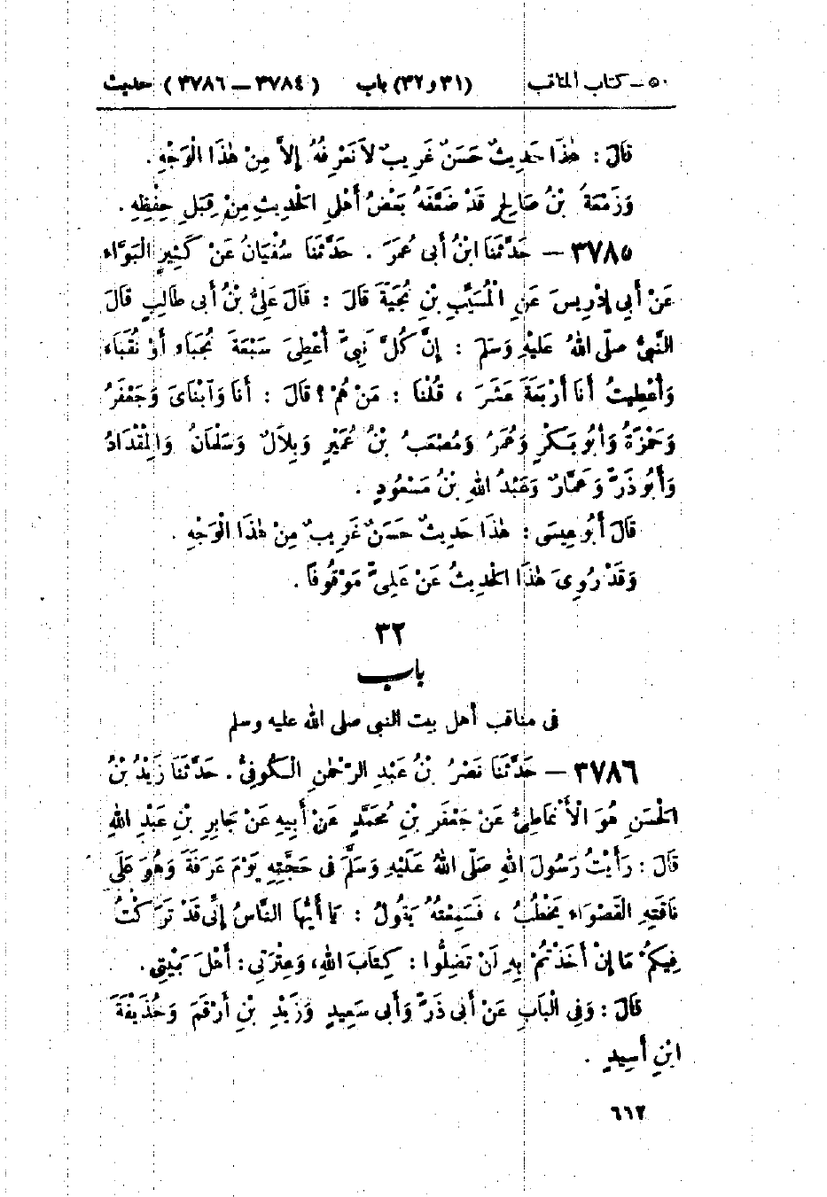 3786 - حَدَّثَنَا نَصْرُ بْنُ عَبْدِ الرَّحْمَنِ الكُوفِيُّ قَالَ: حَدَّثَنَا زَيْدُ بْنُ الحَسَنِ، عَنْ جَعْفَرِ بْنِ مُحَمَّدٍ، عَنْ أَبِيهِ، عَنْ جَابِرِ بْنِ عَبْدِ اللَّهِ، قَالَ: رَأَيْتُ رَسُولَ اللَّهِ صَلَّى اللَّهُ عَلَيْهِ وَسَلَّمَ فِي حَجَّتِهِ يَوْمَ عَرَفَةَ وَهُوَ عَلَى نَاقَتِهِ القَصْوَاءِ يَخْطُبُ، فَسَمِعْتُهُ يَقُولُ: " يَا أَيُّهَا النَّاسُ إِنِّي §تَرَكْتُ فِيكُمْ مَا إِنْ أَخَذْتُمْ بِهِ لَنْ تَضِلُّوا: كِتَابَ اللَّهِ، وَعِتْرَتِي أَهْلَ بَيْتِي " وَفِي البَابِ عَنْ أَبِي ذَرٍّ، وَأَبِي سَعِيدٍ، وَزَيْدِ بْنِ أَرْقَمَ، وَحُذَيْفَةَ بْنِ أَسِيدٍ -[663]- وهَذَا حَدِيثٌ حَسَنٌ غَرِيبٌ مِنْ هَذَا الوَجْهِ. وَزَيْدُ بْنُ الحَسَنِ، قَدْ رَوَى عَنْهُ سَعِيدُ بْنُ سُلَيْمَانَ، وَغَيْرُ وَاحِدٍ مِنْ أَهْلِ العِلْمِ