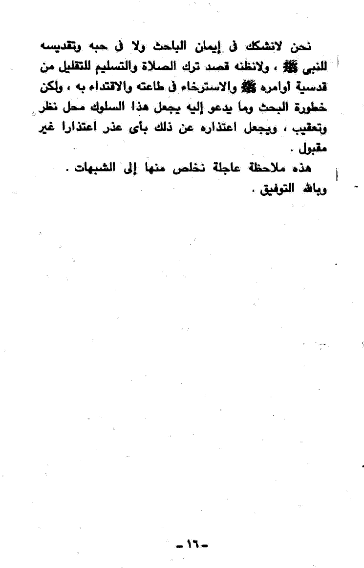 نحن لا نُشكِّكُ في إيمان الباحث ولا في حُبِّهِ وتقديسه للنبي - صَلََّى اللهُ عَلَيْهِ وَسَلَّمَ -، ولا نظنه قصد ترك الصلاة والتسليم للتقليل من قدسية أوامره - صَلََّى اللهُ عَلَيْهِ وَسَلَّمَ - والاسترخاء في طاعته والاقتداء به، ولكن خطورة البحث وما يدعو إليه يجعل هذا السلوك محل نظر وتعقيب، ويجعل اعتذاره عن ذلك بأي عذر اعتذاراً غير مقبول.