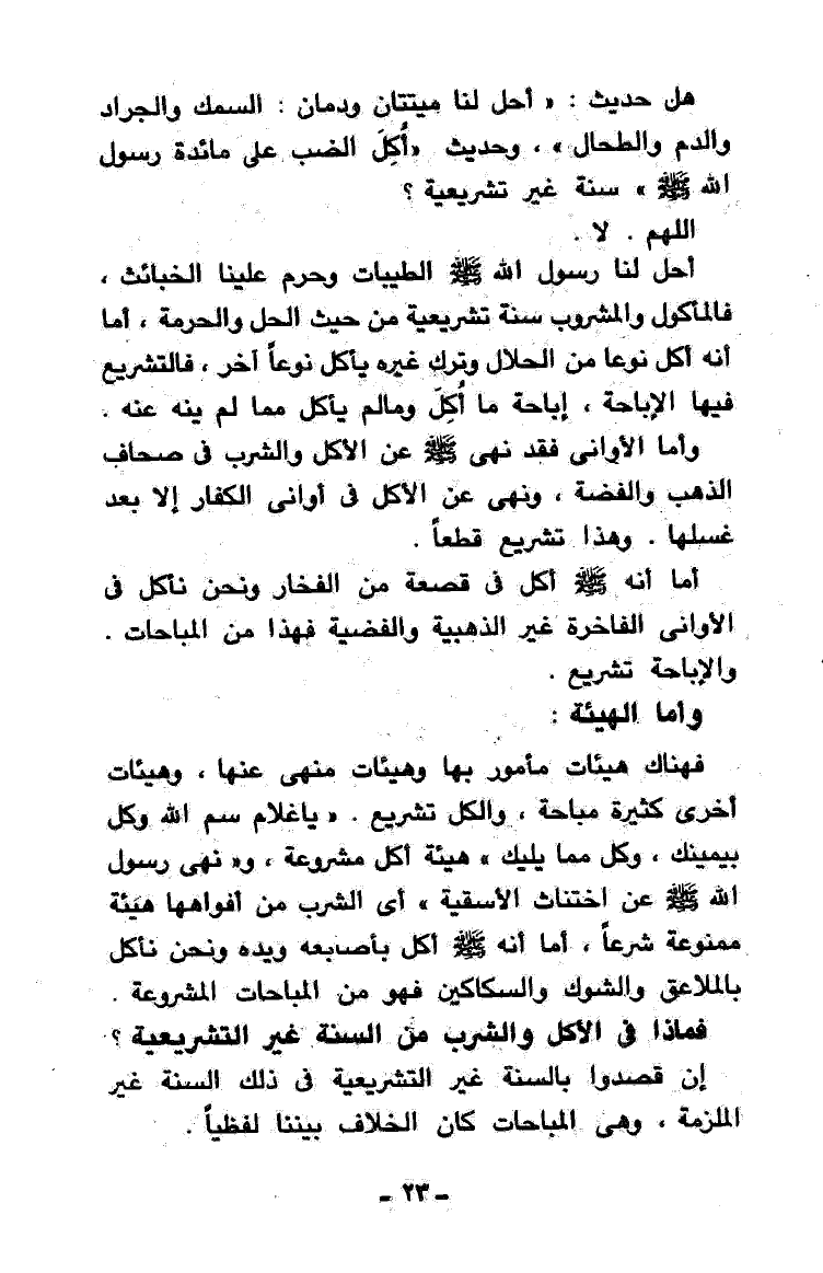 فهناك هيئات مأمور بها وهيئات منهي عنها، وهيئات أخرى كثيرة مباحة، والكل تشريع. «يَا غُلاَمُ سَمِّ اللَّهَ وَكُلْ بِيَمِينِكَ، وَكُلْ مِمَّا يَلِيكَ» هيئة أكل مشروعة، و «نَهَى رَسُولُ اللَّهِ - صَلَّى اللَّهُ عَلَيْهِ وَسَلَّمَ - عَنْ اخْتِنَاثِ الْأَسْقِيَةِ»، أي الشرب من أفواهها هيئة ممنوعة شرعاً، أما أنه - صَلََّى اللهُ عَلَيْهِ وَسَلَّمَ - أكل بأصابعه ويده ونحن نأكل بالملاعق والشوك والسكاكين فهو من المباحات المشروعة.
