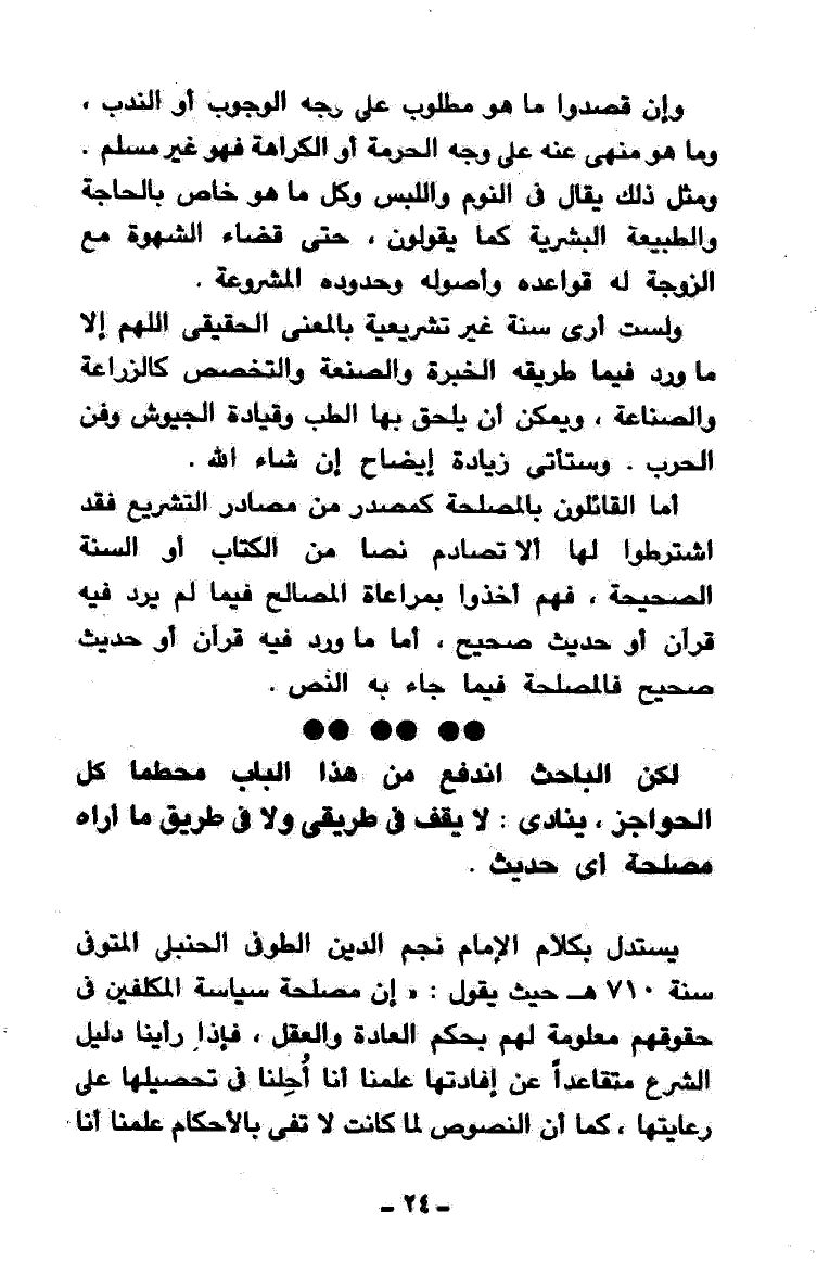 يستدل بكلام الإمام نجم الدين الطوفي الحنبلي المتوفى سنة 710 هـ حيث يقول: «إنَّ مصلحة سياسة المُكَلَّفين في حقوقهم معلومة لهم بحكم العادة والعقل، فإذا رأينا دليل الشرع متقاعداً عن إفادتها علمنا أنا أُحِلْنا في تحصيلها على رعايتها، كما أنَّ النصوص لما كانت لا تفي بالأحكام علمنا أنا