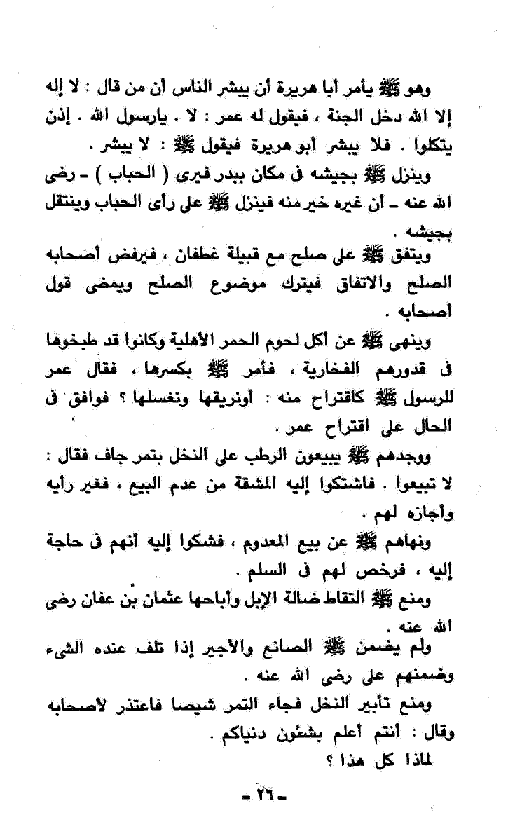 وهو - صَلََّى اللهُ عَلَيْهِ وَسَلَّمَ - يأمر أبا هريرة أن يُبَشِّرَ الناس أنَّ مَنْ قال: لا إله إلاَّ الله دخل الجنة، فيقول له عمر: لا. يا رسول الله. إذن يتَّكِلُوا. فلا يُبَشِّر أبو هريرة فيقول - صَلََّى اللهُ عَلَيْهِ وَسَلَّمَ -: لا يبشر.
