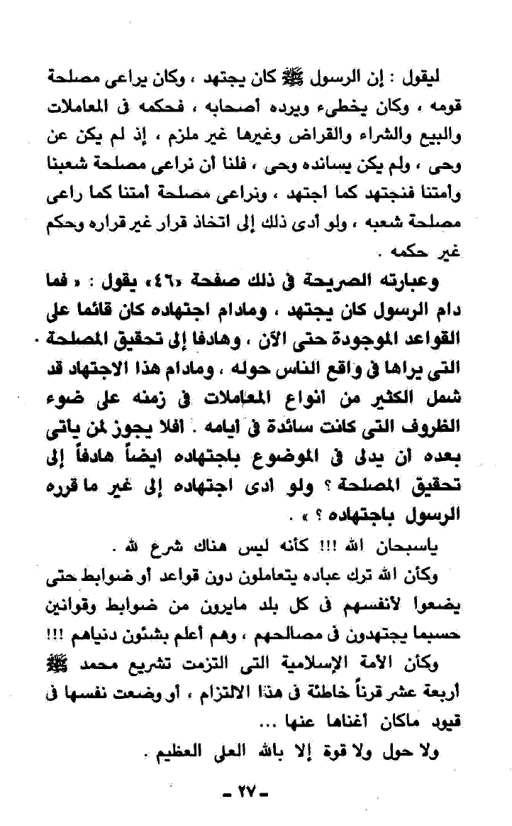 وعبارته الصريحة في ذلك صفحة «46» يقول: «فما دام الرسول كان يجتهد، وما دام اجتهاده كان قائماً على القواعد الموجودة حتى الآن، وهادفاً إلى تحقيق المصلحة التي يراها في واقع الناس حوله، وما دام هذا الاجتهاد قد شمل الكثير من أنواع المعاملات في زمنه على ضوء الظروف التي كانت سائدة في أيامه. أفلا يجوز لمن يأتي بعده أنْ يُدْلِي في الموضوع باجتهاده أيضاً هادفاً إلى تحقيق المصلحة؟ ولو أدَّى اجتهاده إلى غير ما قرَّرَهُ الرسول باجتهاده؟».