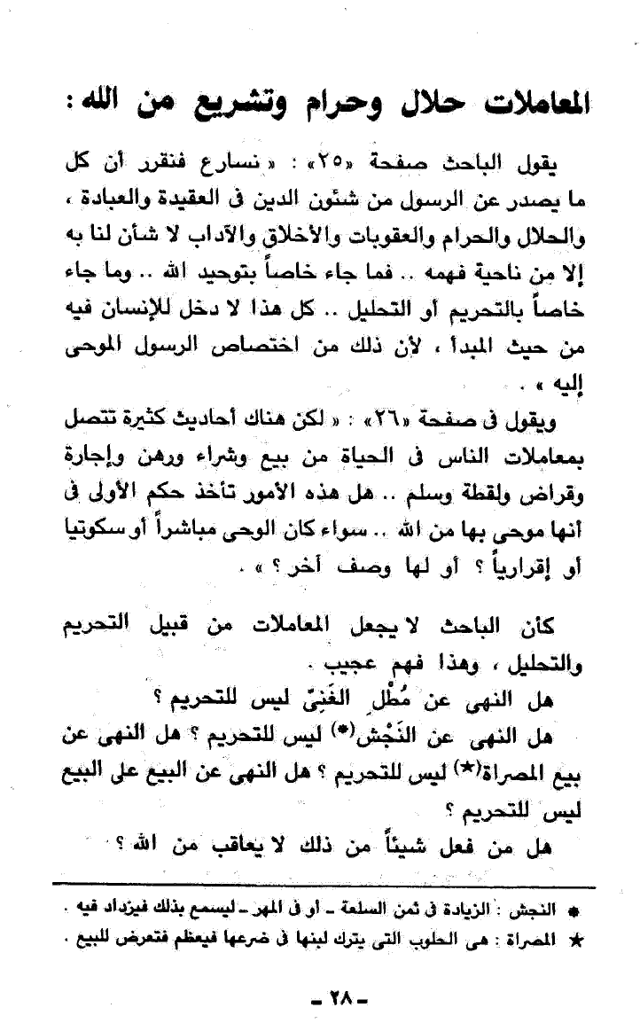 ويقول في صفحة «26»: «لكن هناك أحاديث كثيرة تتصل بمعاملات الناس في الحياة من بيع وشراء ورهن وإجارة وقراض ولقطة وسلم .. هل هذه الأمور تأخذ حكم الأولى في أنها موحى بها من الله .. سواء كان الوحي مباشراً أو سُكُوتياً أو إقرارياً؟ أو لها وصف آخر؟».