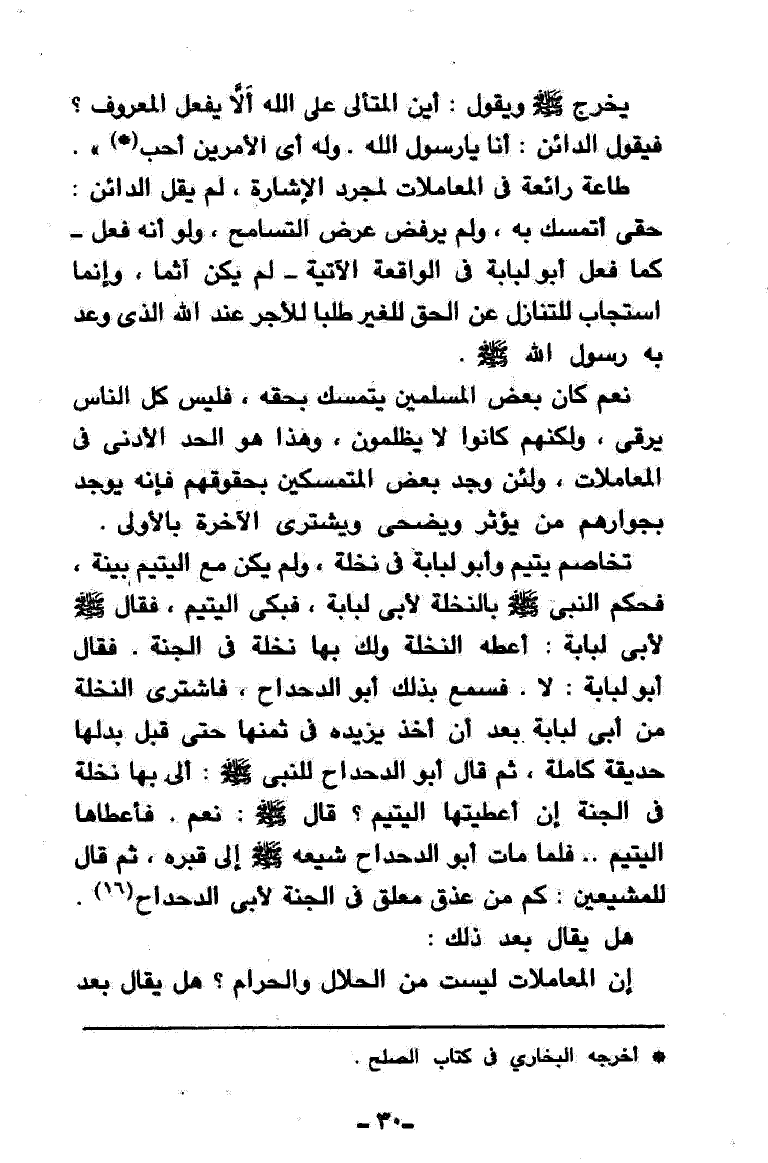 تخاصم يتيم وأبو لبابة في نخلة، ولم يكن مع اليتيم بيِّنَة، فحكم النبي - صَلََّى اللهُ عَلَيْهِ وَسَلَّمَ - بالنخلة لأبي لبابة، فبكى اليتيم، فقال النبي - صَلََّى اللهُ عَلَيْهِ وَسَلَّمَ - لأبي لبابة: «أعطه النخلة ولك بها نخلة في الجنة». فقال أبو لبابة: لا. فسمع بذلك أبو الدحداح، فاشترى النخلة من أبي لبابة بعد أن أخذ يزيده في ثمنها حتى قبِلَ بدلها حديقة كاملة، ثم قال أبو الدحداح للنبي - صَلََّى اللهُ عَلَيْهِ وَسَلَّمَ -: ألِي نخلة في الجنة إنْ أعطيتها اليتيم؟ قال - صَلََّى اللهُ عَلَيْهِ وَسَلَّمَ -: «نَعَمْ». فأعطاها اليتيم .. فلما مات أبو الدحداح شيَّعَهُ - صَلََّى اللهُ عَلَيْهِ وَسَلَّمَ - إلى قبره، ثم قال للمُشَيِّعِين: «كَمْ مِنْ عِذْقٍ مُعَلَّقٍ فِي الْجَنَّةِ لأَبِي الدَّحْدَاحِ» (2).