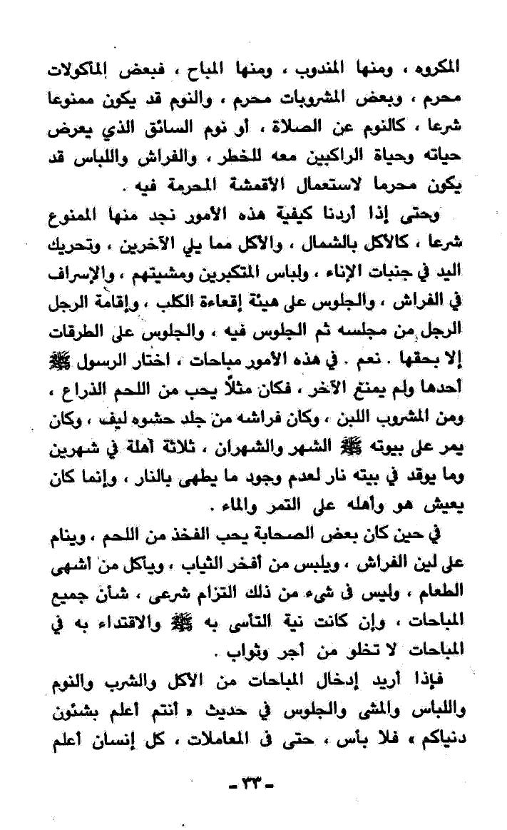 المكروه، ومنها المندوب، ومنها المباح، فبعض المأكولات محرَّمٌ، وبعض المشروبات محرَّمٌ، والنوم قد يكون ممنوعاً شرعاً، كالنوم عن الصلاة، أو نوم السائق الذي يعرِّضُ حياته وحياة الراكبين معه للخطر، والفراش واللباس قد يكون مُحرّماً لاستعمال الأقمشة المُحرَّمة فيه.