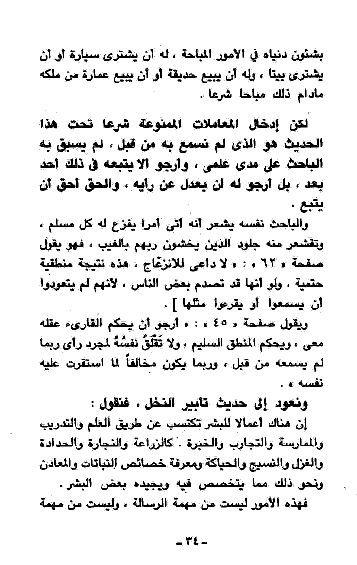 ويقول في صفحة «45»: «أرجو أن يُحَكِّمَ القارئ عقله معي، وَيُحَكِّمَ المنطق السليم، ولا تَقْلَقُ نفسُهُ لمجرَّد رأي ربما لم يسمعه من قبل، وربما يكون مخالفاً لما استقرت عليه نفسه»