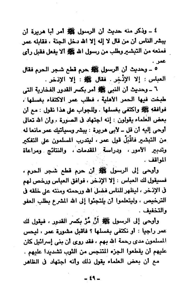 4 - وذكر منه حديث أنَّ الرسول - صَلََّى اللهُ عَلَيْهِ وَسَلَّمَ - أمر أبا هريرة أنْ يُبَشِّرَ الناسَ أنَّ من قال لا إله إلاَّ الله دخل الجنة، فقابله عمر فمنعه من التبشير وطلب من رسول الله - صَلََّى اللهُ عَلَيْهِ وَسَلَّمَ - ألاَّ يفعل فقبل رأي عمر.