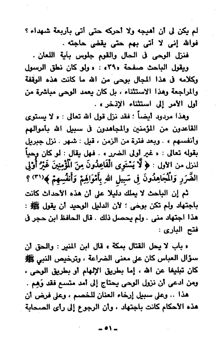 وهذا مردود أيضاً؛ فقد نزل قول الله تعالى: {لَا يَسْتَوِي الْقَاعِدُونَ مِنَ الْمُؤْمِنِينَ غَيْرُ أُولِي الضَّرَرِ وَالْمُجَاهِدُونَ فِي سَبِيلِ اللَّهِ بِأَمْوَالِهِمْ وَأَنْفُسِهِمْ فَضَّلَ اللَّهُ الْمُجَاهِدِينَ بِأَمْوَالِهِمْ وَأَنْفُسِهِمْ} (1). وبعد فترة من الزمن، قيل: شهر. نزل جبريل بقوله تعالى: {غَيْرُ أُولِي الضَّرَرِ}. فهل يقال: لو كان وحياً لنزل من الأول: {لَا يَسْتَوِي الْقَاعِدُونَ مِنَ الْمُؤْمِنِينَ غَيْرُ أُولِي الضَّرَرِ وَالْمُجَاهِدُونَ فِي سَبِيلِ اللَّهِ بِأَمْوَالِهِمْ وَأَنْفُسِهِمْ فَضَّلَ اللَّهُ الْمُجَاهِدِينَ بِأَمْوَالِهِمْ وَأَنْفُسِهِمْ} ثم إنَّ الباحث لا يملك دليلاً على أنَّ هذه الأحداث كانت باجتهاد ولم تكن بوحي؛ لأنَّ الدليل الوحيد أنْ يقول - صَلََّى اللهُ عَلَيْهِ وَسَلَّمَ -: هذا اجتهاد مني. ولم يحصل ذلك. قال الحافظ ابن حجر في فتح الباري: «باب لا يحل القتال بمكة» قال ابن المنير: «والحق أنَّ سؤال العباس كان على معنى الضراعة وترخيص النبي صلى الله عليه وسلم كان تبليغا عن الله إما بطريق الالهام أو بطريق الوحي ومن ادعى أن نزول الوحي يحتاج إلى أمد متسع فقد وهم» (2).