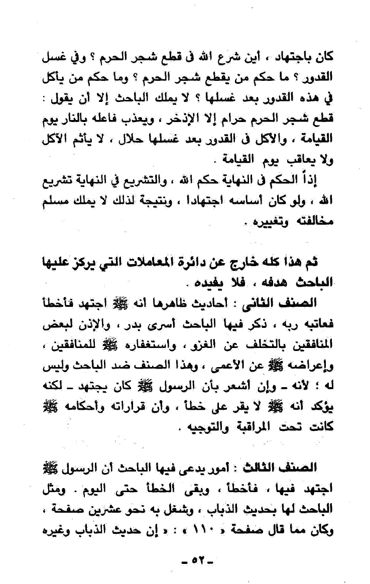 الصنف الثاني: أحاديث ظاهرها أنه - صَلََّى اللهُ عَلَيْهِ وَسَلَّمَ - اجتهد فأخطأ فعاتبه ربه، ذكر فيها الباحث أسرى بدر، والإذن لبعض المنافقين بالتخلف عن الغزو، واستغفاره - صَلََّى اللهُ عَلَيْهِ وَسَلَّمَ - للمنافقين، وإعراضه - صَلََّى اللهُ عَلَيْهِ وَسَلَّمَ - عن الأعمى، وهذا الصنف ضد الباحث وليس له - وإنْ أشعر بأنَّ الرسول - صَلََّى اللهُ عَلَيْهِ وَسَلَّمَ - كان يجتهد - لكنه يؤكِّدُ أنه - صَلََّى اللهُ عَلَيْهِ وَسَلَّمَ - لا يقر على خطأ، وأنَّ قراراته وأحكامه - صَلََّى اللهُ عَلَيْهِ وَسَلَّمَ - كانت تحت المراقبة والتوجيه.