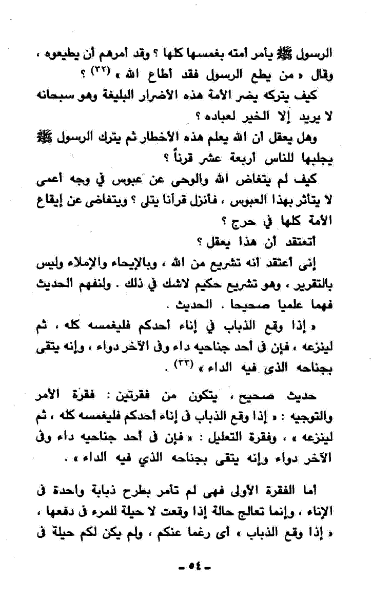 الرسول - صَلََّى اللهُ عَلَيْهِ وَسَلَّمَ - يأمر أمَّتَهُ بغمسها كلها؟ وقد أمرهم أن يطيعوه، وقال: {مَنْ يُطِعِ الرَّسُولَ فَقَدْ أَطَاعَ اللَّهَ}؟ (1).