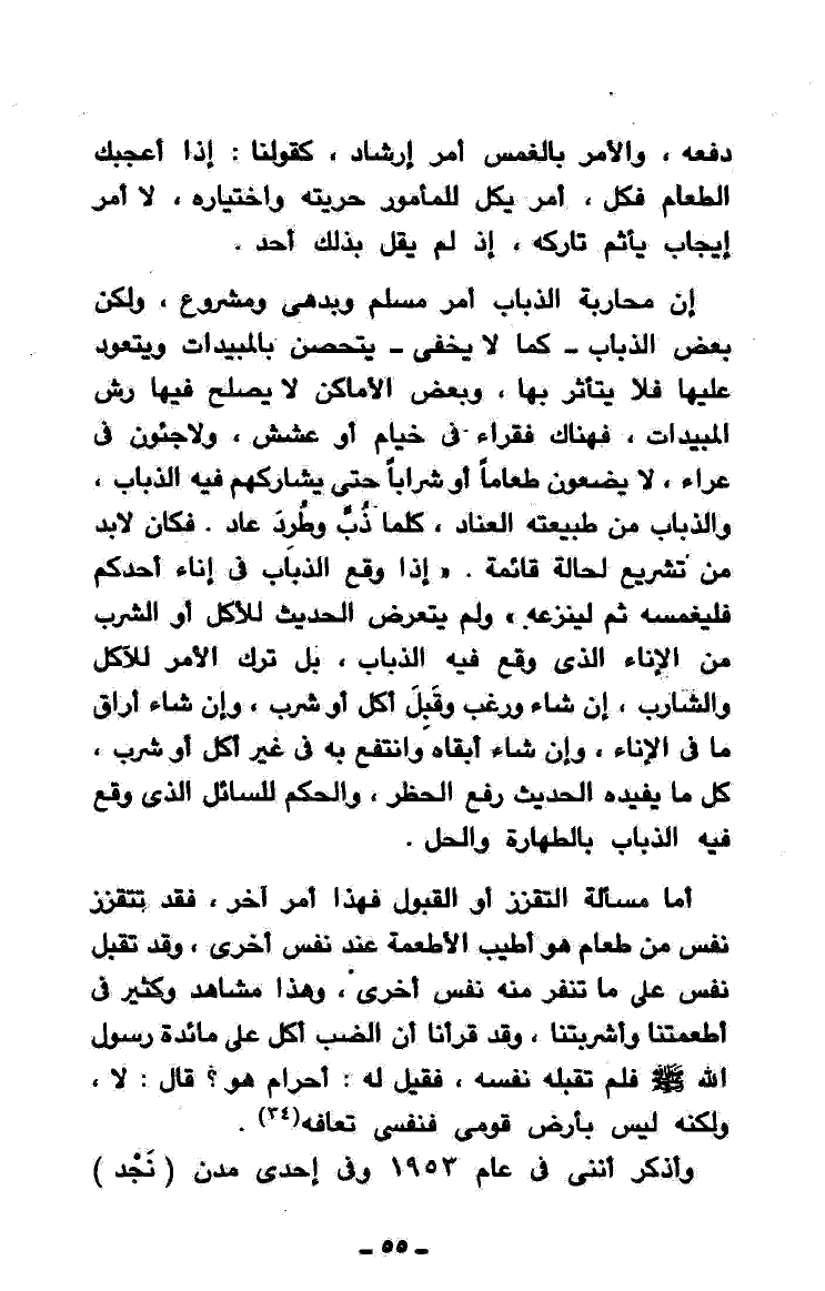 إنَّ محاربة الذباب أمر مُسَلَّمٌ وبدهي ومشروع، ولكن بعض الذباب - كما لا يخفى - يتحصَّنُ بالمُبِيدات ويتعوَّدُ عليها فلا يتأثَّرُ بها، وبعض الأماكن لا يصلح فيها رش المُبيدات، فهناك فقراء في خيام أو عِشش، ولاجئون في عراء، لا يضعون طعاماً أو شراباً حتى يشاركهم فيه الذباب، والذباب من طبيعته العناد، كلما ذُبَّ وطُرِدَ عاد. فكان لا بُدَّ من تشريع لحالة قائمة. «إِذَا وَقَعَ الذُّبَابُ فِي إِنَاءِ أَحَدِكُمْ فَلْيَغْمِسْهُ، ثُمَّ لِيَنْزِعَهُ»، ولم يتعرَّض الحديث للأكل أو الشرب من الإناء الذي وقع فيه الذباب، بل ترك الأمر للآكل والشارب، إنْ شاء ورغب وقَبِلَ أكل أو شرب، وإنْ شاء أراق ما في الإناء، وإنْ شاء أبقاه وانتفع به في غير أكل أو شرب، كل ما يفيده الحديث رفع الحظر، والحُكم للسائل الذي وقع فيه الذباب بالطهارة والحل.