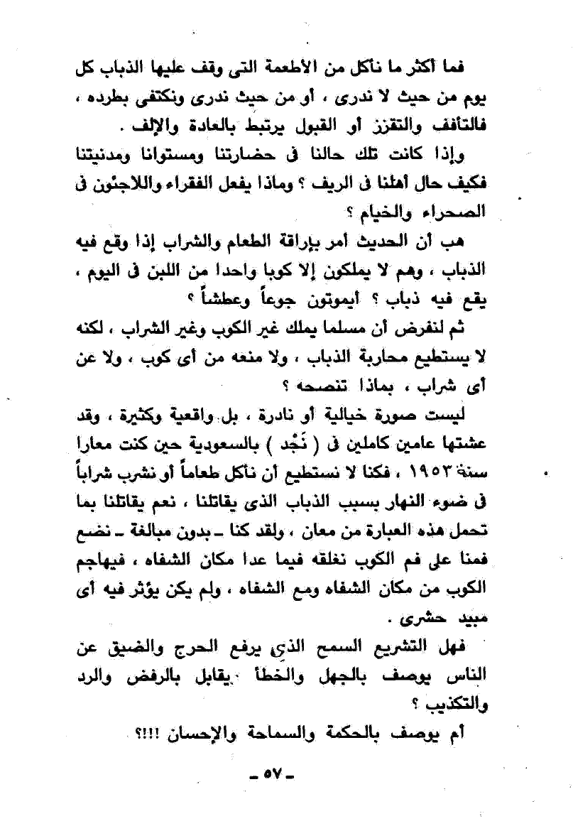 ليست صورة خيالية أو نادرة، بل واقعية وكثيرة، وقد عِشتُها عامين كاملين في (نَجْد) بالسعودية حين كنتُ مُعاراً سنة 1953، فكنا لا نستطيع أنْ نأكل طعاماً أو نشرب شراباً في ضوء النهار بسبب الذباب الذي يقاتلنا، نعم يقاتلنا بما تحمل العبارة من معان، لقد كنا - بدون مبالغة - نضع فمنا على فم الكوب نغلقه فيما عدا مكان الشفاه، فيهاجم الكوب من كل مكان الشفاه ومع الشفاه، ولم يكن يؤثِّرُ فيه أي مُبيد حشري.