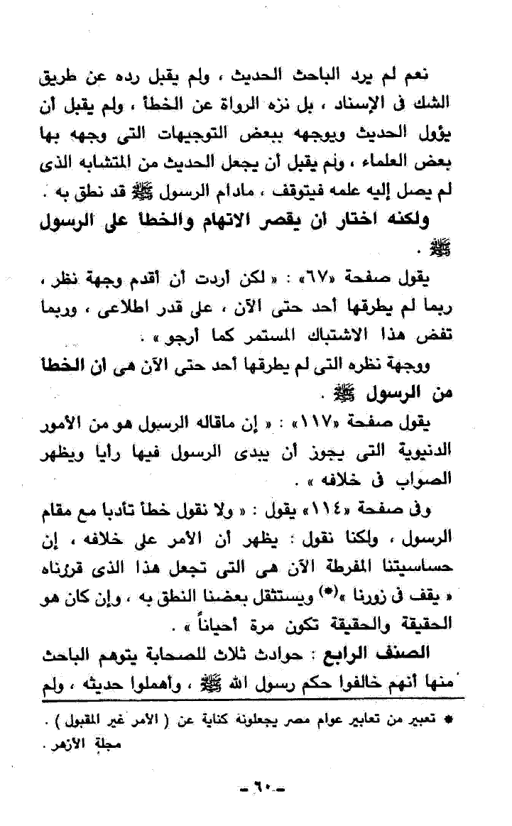 وفي صفحة «114» يقول: «ولا نقول خطأ تأدُّباً مع مقام الرسول، ولكنا نقول: يظهر أنّض الأمر على خلافه، إنَّ حساسيتنا المفرطة الآن هي التي تجعل هذا الذي قرَّرْناهُ " يقف في زورنا " (*) ويستثقل بعضنا النطق به، وإنْ كان هو الحقيقة والحقيقة تكون مرة أحياناً».