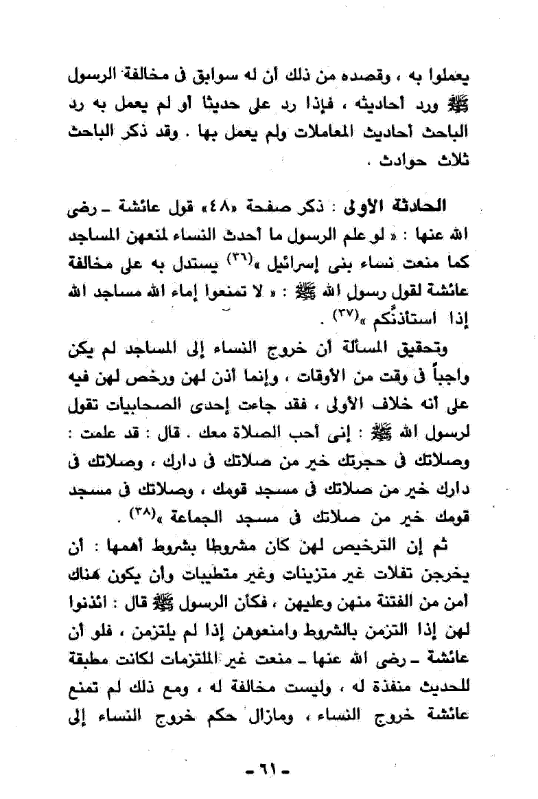 الحادثة الأولى: ذكر صفحة «48» قول عائشة - رَضِيَ اللهُ عَنْهَا -: «لو علم الرسول ما أحدث النساء لمنعهن المساجد كما منعت نساء بني إسرائيل» (1)، يستدل به على مخالفة عائشة لقول رسول الله - صَلََّى اللهُ عَلَيْهِ وَسَلَّمَ -: «لاَ تَمْنَعُوا إِمَاءَ اللَّهِ مَسَاجِدَ اللَّهِ إِذَا اسْتَأْذَتَّكُمْ» (2).