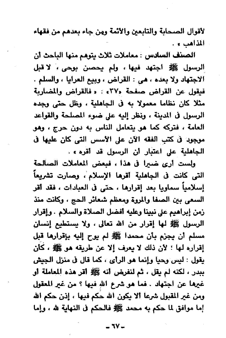 الصنف السادس: معاملات ثلاث يتوهَّمُ منها الباحث أنَّ الرسول - صَلََّى اللهُ عَلَيْهِ وَسَلَّمَ - اجتهد فيها، ولم يحصن بوحي، لا قبل الاجتهاد ولا بعده، هي: القراض، وبيع العرايا، والسَلَم. فيقول عن القراض صفحة «37»: «فالقراض والمضاربة مثلاً كان نظاماً معمولاً به في الجاهلية، وظل حتى وجده الرسول في المدينة، ونظر إليه على ضوء المصلحة والقواعد العامة، فتركه كما هو يتعامل الناس به دون حرج، وهو موجود في كتب الفقه الآن على الأسس التي كان عليها في الجاهلية على اعتبار أنَّ الرسول قد أقرّهُ».