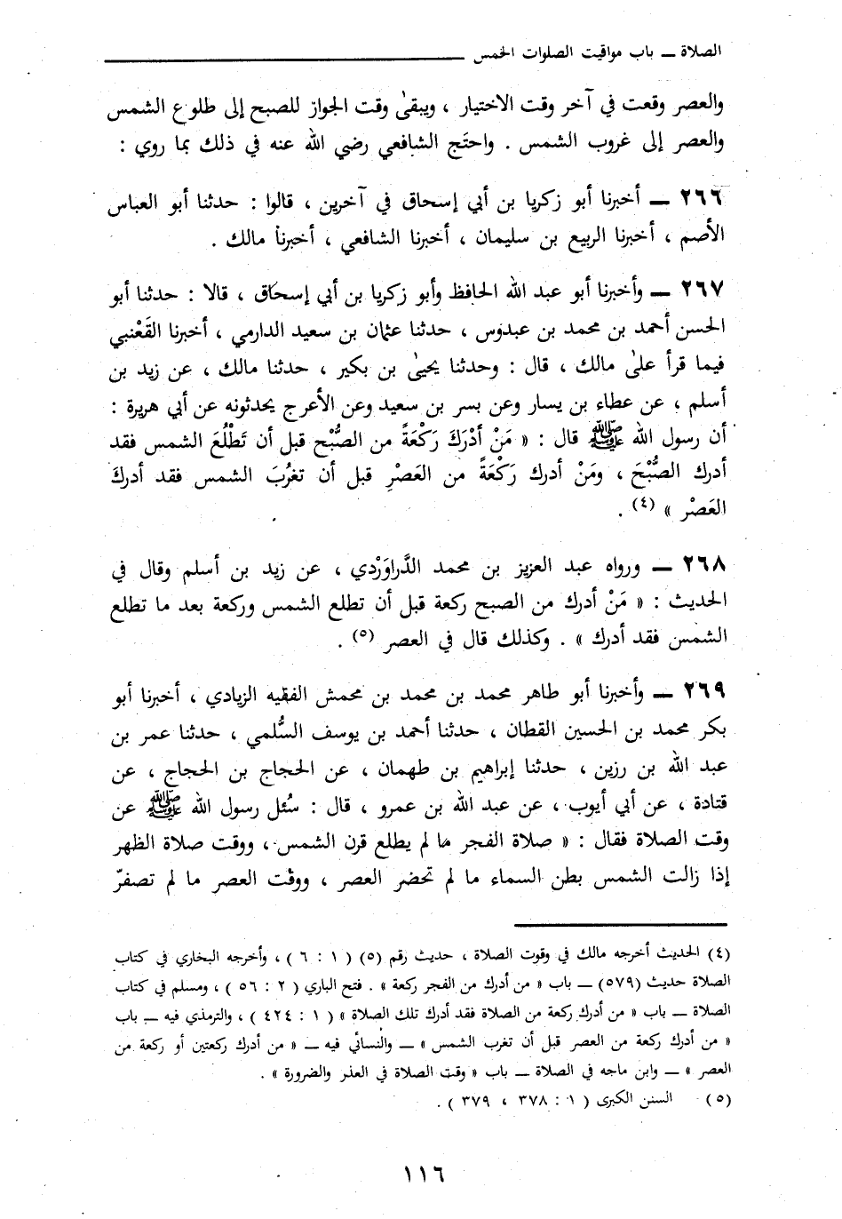 267 - وَأَخْبَرَنَا أَبُو عَبْدِ اللَّهِ الْحَافِظُ، وَأَبُو زَكَرِيَّا بْنُ أَبِي إِسْحَاقَ قَالَا: نا أَبُو الْحَسَنِ أَحْمَدُ بْنُ مُحَمَّدِ بْنِ عَبْدوسَ، نا عُثْمَانُ بْنُ سَعِيدٍ الدَّارِمِيُّ، أنا الْقَعْنَبِيُّ، فِيمَا قُرِئَ عَلَى مَالِكٍ قَالَ: وَحَدَّثَنَا يَحْيَى بْنُ بُكَيْرٍ، نا مَالِكٌ، عَنْ زَيْدِ بْنِ أَسْلَمَ، عَنْ عَطَاءِ بْنِ يَسَارٍ، وَعَنْ بُسْرِ بْنِ سَعِيدٍ، وَعَنِ الْأَعْرَجِ، يُحَدِّثُونَهُ عَنْ أَبِي هُرَيْرَةَ، أَنَّ رَسُولَ اللَّهِ صَلَّى اللهُ عَلَيْهِ وَسَلَّمَ قَالَ: § «مَنْ أَدْرَكَ رَكْعَةً مِنَ الصُّبْحِ قَبْلَ أَنْ تَطْلُعَ الشَّمْسُ فَقَدْ أَدْرَكَ الصُّبْحَ، وَمَنْ أَدْرَكَ رَكْعَةً مِنَ الْعَصْرِ قَبْلَ أَنْ تَغْرُبَ الشَّمْسُ فَقَدْ أَدْرَكَ الْعَصْرَ»