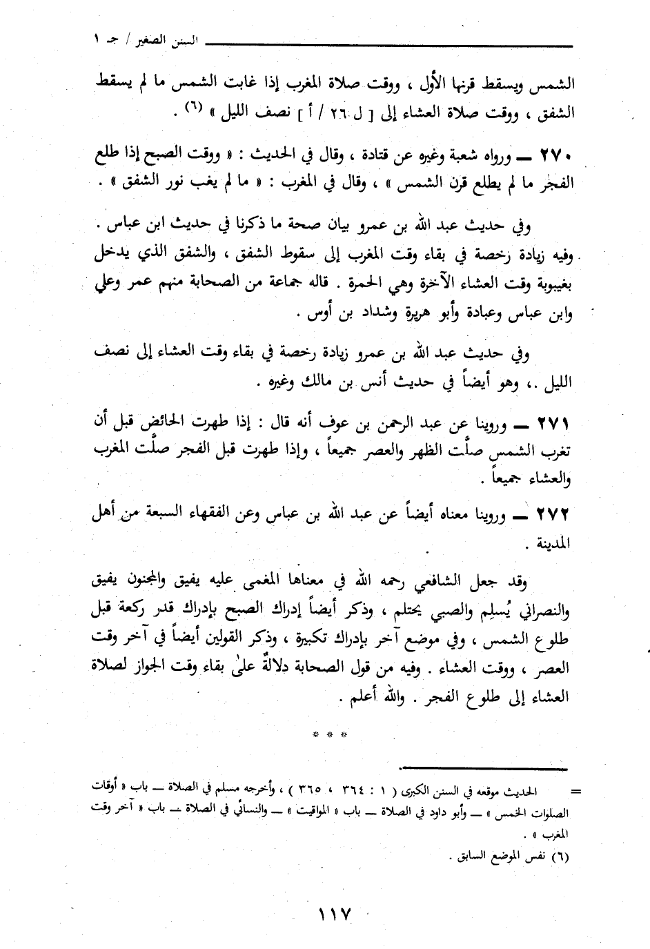 272 - وَرُوِّينَا مَعْنَاهُ، أَيْضًا عَنْ عَبْدِ اللَّهِ بْنِ عَبَّاسٍ، وَعَنِ الْفُقَهَاءِ السَّبْعَةِ، مِنْ أَهْلِ الْمَدِينَةِ، وَقَدْ جَعَلَ الشَّافِعِيُّ رَحِمَهُ اللَّهُ فِي مَعْنَاهَا الْمُغْمَى عَلَيْهِ يُفِيقُ وَالْمَجْنُونُ يُفِيقُ، وَالنَّصْرَانِيُّ يُسْلِمُ وَالصَّبِيُّ يَحْتَلِمُ، وَذَكَرَ أَيْضًا إِدْرَاكَ الصُّبْحِ بِإِدْرَاكَ قَدْرِ رَكْعَةٍ قَبْلَ طُلُوعِ الشَّمْسِ وَفِي مَوْضِعٍ آخَرَ بِإِدْرَاكِ قَدْرِ تَكْبِيرَةٍ، وَذَكَرَ الْقَوْلَيْنِ أَيْضًا فِي آخِرِ وَقْتِ الْعَصْرِ، وَوَقْتِ الْعِشَاءِ وَفِيهِ مِنْ قَوْلِ الصَّحَابَةِ دَلَالَةٌ عَلَى تَفَاوَتِ وَقْتِ الْجَوَازِ لِصَلَاةِ الْعِشَاءِ إِلَى طُلُوعِ الْفَجْرِ وَاللَّهُ أَعْلَمُ