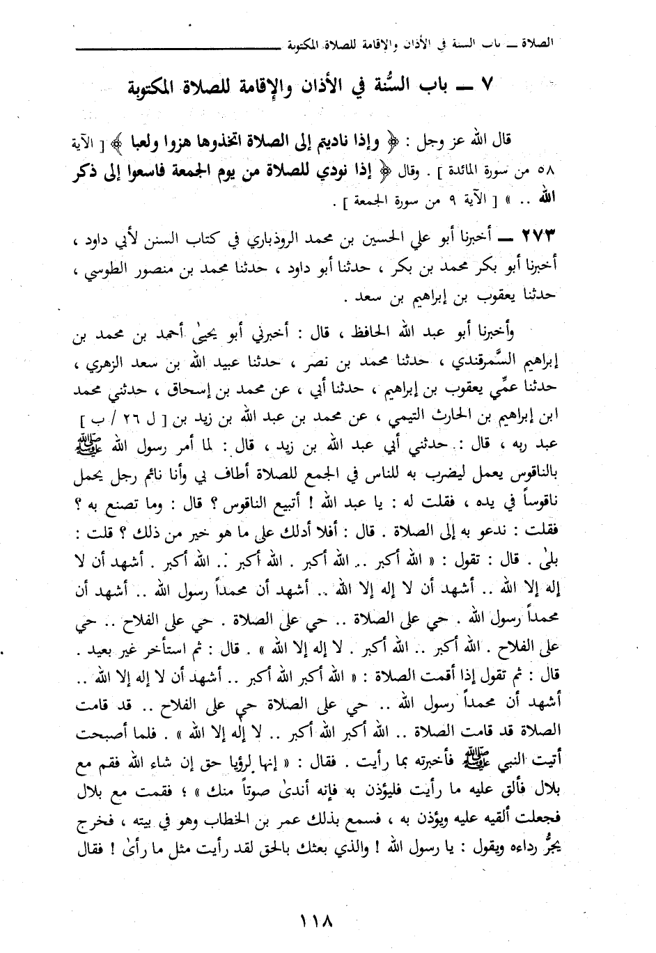 273 - أَخْبَرَنَا أَبُو عَلِيٍّ الْحُسَيْنُ بْنُ مُحَمَّدٍ الرُّوذْبَارِيُّ، فِي كِتَابِ السُّنَنِ لِأَبِي دَاوُدَ أنا أَبُو بَكْرٍ مُحَمَّدُ بْنُ بَكْرٍ، نا أَبُو دَاوُدَ، نا مُحَمَّدُ بْنُ مَنْصُورٍ الطُّوسِيُّ، نا يَعْقُوبُ بْنُ إِبْرَاهِيمَ بْنِ سَعْدٍ، وَأَخْبَرَنَا أَبُو عَبْدِ اللَّهِ الْحَافِظُ، قَالَ: أَخْبَرَنِي أَبُو يَحْيَى أَحْمَدُ بْنُ مُحَمَّدِ بْنِ إِبْرَاهِيمَ السَّمَرْقَنْدِيُّ، نا مُحَمَّدُ بْنُ نَصْرٍ، نا عُبَيْدُ اللَّهِ بْنُ سَعْدٍ الزُّهْرِيُّ، نا عَمِّي يَعْقُوبُ بْنُ إِبْرَاهِيمَ، نا أَبِي، عَنْ مُحَمَّدِ بْنِ إِسْحَاقَ، حَدَّثَنِي مُحَمَّدُ بْنُ إِبْرَاهِيمَ بْنِ الْحَارِثِ التَّيْمِيُّ، عَنْ مُحَمَّدِ بْنِ عَبْدِ اللَّهِ بْنِ زَيْدِ بْنِ عَبْدِ رَبِّهِ، قَالَ: حَدَّثَنِي أَبِي عَبْدُ اللَّهِ بْنِ زَيْدٍ، قَالَ: §" لَمَّا أَمَرَ رَسُولُ اللَّهِ صَلَّى اللهُ عَلَيْهِ وَسَلَّمَ بِالنَّاقُوسِ يُعْمَلُ لِيُضْرَبَ بِهِ لِلنَّاسِ فِي الْجَمْعِ لِلصَّلَاةِ طَافَ بِي وَأَنَا نَائِمٌ رَجُلٌ يَحْمِلُ نَاقُوسًا فِي يَدِهِ فَقُلْتُ لَهُ: يَا عَبْدَ اللَّهِ، أَتَبِيعُ النَّاقُوسَ؟ قَالَ: وَمَا تَصْنَعُ بِهِ؟ فَقُلْتُ: نَدْعُو بِهِ إِلَى الصَّلَاةِ قَالَ: أَفَلَا أَدُلُّكَ عَلَى مَا هُوَ خَيْرٌ مِنْ ذَلِكَ؟ قُلْتُ: بَلَى. قَالَ: تَقُولُ: اللَّهُ أَكْبَرُ اللَّهُ أَكْبَرُ اللَّهُ أَكْبَرُ اللَّهُ أَكْبَرُ أَشْهَدُ أَنْ لَا إِلَهَ إِلَّا اللَّهُ أَشْهَدُ أَنْ لَا إِلَهَ إِلَّا اللَّهُ أَشْهَدُ أَنَّ مُحَمَّدًا رَسُولُ اللَّهِ أَشْهَدُ أَنَّ مُحَمَّدًا رَسُولُ اللَّهِ حَيَّ عَلَى الصَّلَاةِ حَيَّ عَلَى الصَّلَاةِ حَيَّ عَلَى الْفَلَاحِ حَيَّ عَلَى الْفَلَاحِ اللَّهُ أَكْبَرُ اللَّهُ أَكْبَرُ لَا إِلَهَ إِلَّا اللَّهُ ثُمَّ اسْتَأْخَرَ غَيْرَ بَعِيدٍ قَالَ: ثُمَّ تَقُولُ إِذَا أَقَمْتَ الصَّلَاةَ: اللَّهُ أَكْبَرُ اللَّهُ أَكْبَرُ أَشْهَدُ أَنْ لَا إِلَهَ إِلَّا اللَّهُ أَشْهَدُ أَنَّ مُحَمَّدًا رَسُولُ اللَّهِ حَيَّ عَلَى الصَّلَاةِ حَيَّ عَلَى الْفَلَاحِ قَدْ قَامَتِ الصَّلَاةُ قَدْ قَامَتِ الصَّلَاةُ اللَّهُ أَكْبَرُ اللَّهُ أَكْبَرُ لَا إِلَهَ إِلَّا اللَّهُ. فَلَمَّا أَصْبَحْتُ أَتَيْتُ النَّبِيَّ صَلَّى اللهُ عَلَيْهِ وَسَلَّمَ فَأَخْبَرْتُهُ بِمَا رَأَيْتُ فَقَالَ: «إِنَّهَا لَرُؤْيَا حَقٌّ إِنْ شَاءَ اللَّهُ فَقُمْ مَعَ بِلَالٍ فَأَلْقِ عَلَيْهِ مَا رَأَيْتَ فَلْيُؤَذِّنْ بِهِ فَإِنَّهُ أَنْدَى صَوْتًا مِنْكَ» فَقُمْتُ مَعَ بِلَالٍ فَجَعَلْتُ أُلْقِيهِ عَلَيْهِ وَيُؤَذِّنُ بِهِ فَسَمِعَ بِذَلِكَ عُمَرُ بْنُ الْخَطَّابِ وَهُوَ فِي بَيْتِهِ فَخَرَجَ يَجُرُّ رِدَاءَهُ وَيَقُولُ: يَا رَسُولَ اللَّهِ وَالَّذِي بَعَثَكَ بِالْحَقِّ لَقَدْ رَأَيْتُ مِثْلَ مَا رَأَى. فَقَالَ -[117]- رَسُولُ اللَّهِ صَلَّى اللهُ عَلَيْهِ وَسَلَّمَ: «فَلِلَّهِ الْحَمْدُ» لَفْظُ حَدِيثِ أَبِي عَبْدِ اللَّهِ