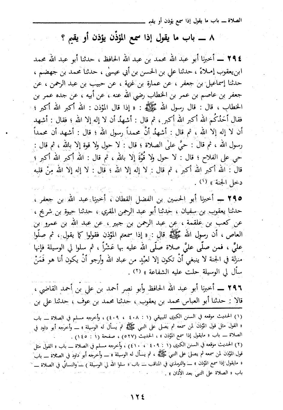 296 - أَخْبَرَنَا أَبُو عَبْدِ اللَّهِ الْحَافِظُ، وَأَبُو نَصْرٍ أَحْمَدُ بْنُ عَلِيِّ بْنِ أَحْمَدَ الْقَاضِي قَالَا: أنا أَبُو الْعَبَّاسِ مُحَمَّدُ بْنُ يَعْقُوبَ، نا مُحَمَّدُ بْنُ عَوْفٍ، نا عَلِيُّ بْنُ -[123]- عَيَّاشٍ، نا شُعَيْبُ بْنُ أَبِي حَمْزَةَ، عَنْ مُحَمَّدِ بْنِ الْمُنْكَدِرِ، عَنْ جَابِرِ بْنِ عَبْدِ اللَّهِ، قَالَ: قَالَ رَسُولُ اللَّهِ صَلَّى اللهُ عَلَيْهِ وَسَلَّمَ: " §مَنْ قَالَ حِينَ يَسْمَعُ النِّدَاءَ: اللَّهُمَّ إِنَّى أَسْأَلُكَ بِحَقِّ هَذِهِ الدَّعْوَةِ التَّامَّةِ، وَالصَّلَاةِ الْقَائِمَةِ آتِ مُحَمَّدًا الْوَسِيلَةَ وَالْفَضِيلَةَ، وَابْعَثْهُ مَقَامًا مَحْمُودًا، الَّذِي وَعَدْتَهُ إِنَّكَ لَا تُخْلِفُ الْمِيعَادَ إِلَّا حَلَّتْ لَهُ شَفَاعَتِي "