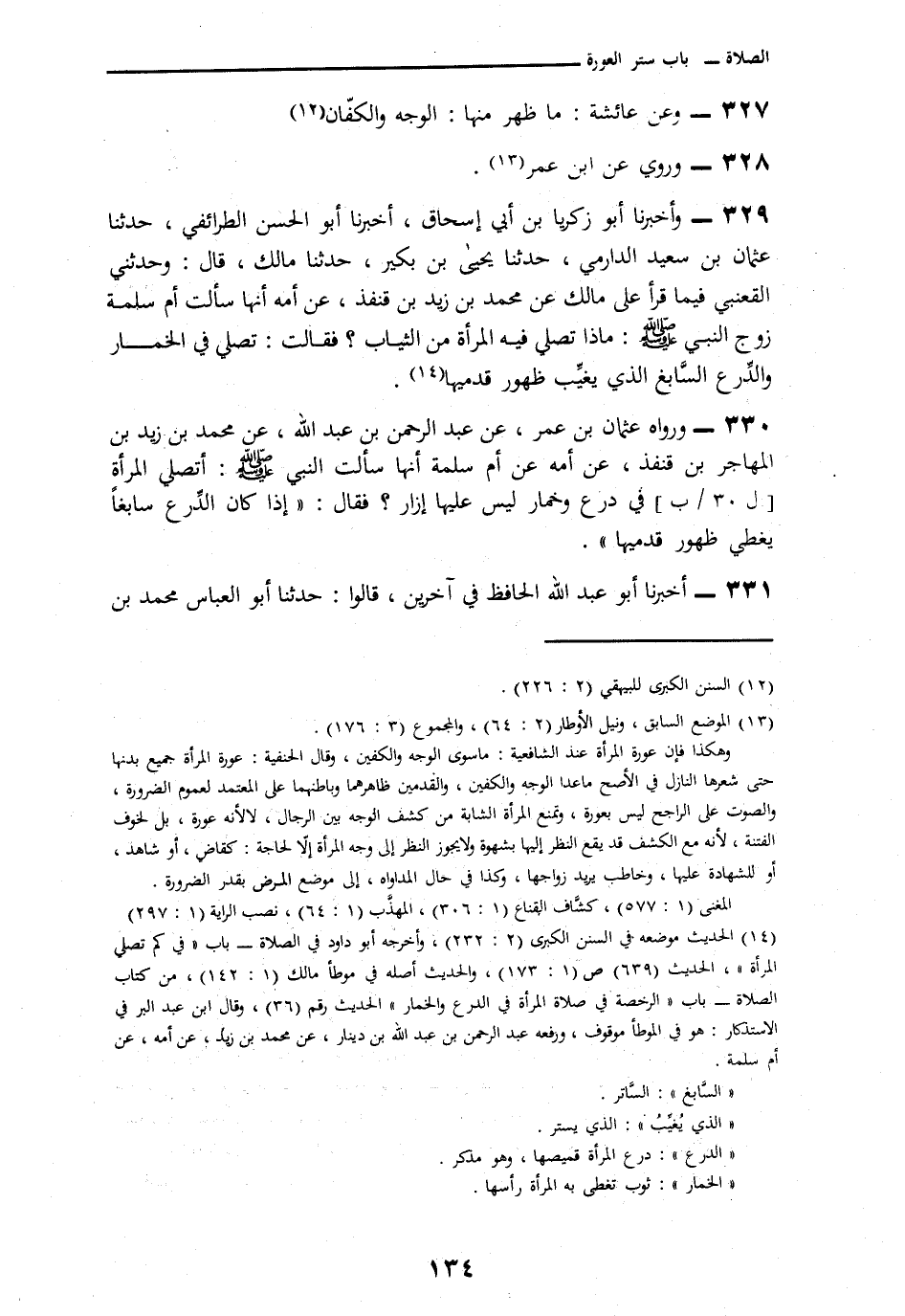 330 - وَرَوَاهُ عُثْمَانُ بْنُ عُمَرَ، عَنْ عَبْدِ الرَّحْمَنِ بْنِ عَبْدِ اللَّهِ، عَنْ مُحَمَّدِ بْنِ زَيْدِ بْنِ الْمُهَاجِرِ بْنِ قُنْفُذٍ، عَنْ أُمِّهِ، عَنْ أُمِّ سَلَمَةَ، أَنَّهَا قَالَتْ سَأَلْتُ النَّبِيَّ صَلَّى اللهُ عَلَيْهِ وَسَلَّمَ: §" أَتُصَلِّي الْمَرْأَةُ فِي دِرْعٍ وَخِمَارٍ لَيْسَ عَلَيْهَا إِزَارٌ؟ فَقَالَ: «إِذَا كَانَ الدِّرْعُ سَابِغًا يُغَطِّي ظُهُورَ قَدَمَيْهَا»