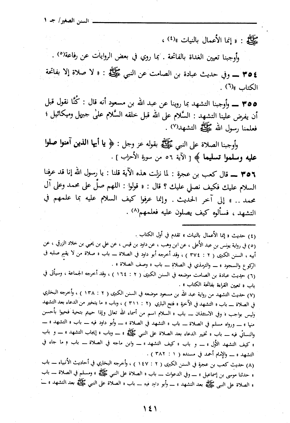 356 - قَالَ كَعْبُ بْنُ عُجْرَةَ: لَمَّا نَزَلَتْ هَذِهِ الْآيَةُ قُلْنَا: يَا رَسُولَ اللَّهِ إِنَّا قَدْ عَرَفْنَا السَّلَامَ عَلَيْكَ فَكَيْفَ نُصَلِّي عَلَيْكَ؟ قَالَ: " قُولُوا: §اللَّهُمَّ صَلِّ عَلَى مُحَمَّدٍ وَعَلَى آلِ مُحَمَّدٍ " وَإِلَى آخِرِ الْحَدِيثِ، وَإِنَّمَا عَرَفُوا كَيْفَ السَّلَامُ عَلَيْهِ بِمَا عَلَّمَهُمْ فِي التَّشَهُّدِ فَسَأَلُوهُ كَيْفَ يُصَلُّونَ عَلَيْهِ فَعَلَّمَهُمْ