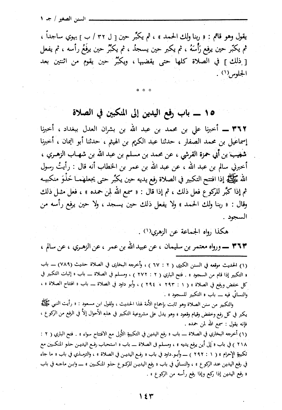 362 - أَخْبَرَنَا عَلِيُّ بْنُ مُحَمَّدِ بْنِ عَبْدِ اللَّهِ بْنِ بِشْرَانَ الْعَدْلُ، بِبَغْدَادَ، أنا إِسْمَاعِيلُ بْنُ مُحَمَّدٍ الصَّفَّارُ، نا عَبْدُ الْكَرِيمِ بْنُ الْهَيْثَمِ، نا أَبُو الْيَمَانِ، أنا شُعَيْبُ بْنُ أَبِي حَمْزَةَ الْقُرَشِيُّ، عَنْ مُحَمَّدِ بْنِ مُسْلِمِ بْنِ عَبْدِ اللَّهِ بْنِ شِهَابٍ الزُّهْرِيِّ، أَخْبَرَنِي سَالِمُ بْنُ عَبْدِ اللَّهِ، عَنْ عَبْدِ اللَّهِ بْنِ عُمَرَ بْنِ الْخَطَّابِ، أَنَّهُ قَالَ: " رَأَيْتُ رَسُولَ اللَّهِ صَلَّى اللهُ عَلَيْهِ وَسَلَّمَ إِذَا افْتَتَحَ التَّكْبِيرَ فِي الصَّلَاةِ رَفَعَ يَدَيْهِ حِينَ يُكَبِّرُ حَتَّى يَجْعَلَهُمَا حَذْوَ مَنْكِبَيْهِ، ثُمَّ إِذَا كَبَّرَ لِلرُّكُوعِ فَعَلَ ذَلِكَ، ثُمَّ إِذَا قَالَ: «§سَمِعَ اللَّهُ لِمَنْ حَمِدَهُ» فَعَلَ مِثْلَ ذَلِكَ وَقَالَ: «رَبَّنَا وَلَكَ الْحَمْدُ» وَلَا يَفْعَلُ ذَلِكَ حِينَ يَسْجُدُ، وَلَا حِينَ يَرْفَعُ رَأْسَهُ مِنَ السُّجُودِ "