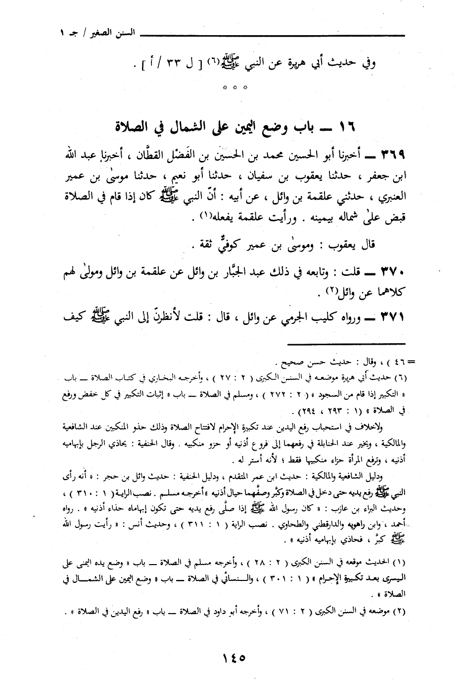 369 - أَخْبَرَنَا أَبُو الْحُسَيْنِ مُحَمَّدُ بْنُ الْحُسَيْنِ بْنِ الْفَضْلِ الْقَطَّانُ، أنا عَبْدُ اللَّهِ بْنُ جَعْفَرٍ، نا يَعْقُوبُ بْنُ سُفْيَانَ، نا أَبُو نُعَيْمٍ، نا مُوسَى بْنُ عُمَيْرٍ الْعَنْبَرِيُّ، حَدَّثَنِي عَلْقَمَةُ بْنُ وَائِلٍ، عَنْ أَبِيهِ، أَنَّ النَّبِيَّ صَلَّى اللهُ عَلَيْهِ وَسَلَّمَ § «كَانَ إِذَا قَامَ فِي الصَّلَاةِ قَبَضَ عَلَى شِمَالِهِ بِيَمِينِهِ وَرَأَيْتُ عَلْقَمَةَ يَفْعَلُهُ» قَالَ يَعْقُوبُ: وَمُوسَى بْنُ عُمَيْرٍ كُوفِيُّ ثِقَةٌ.