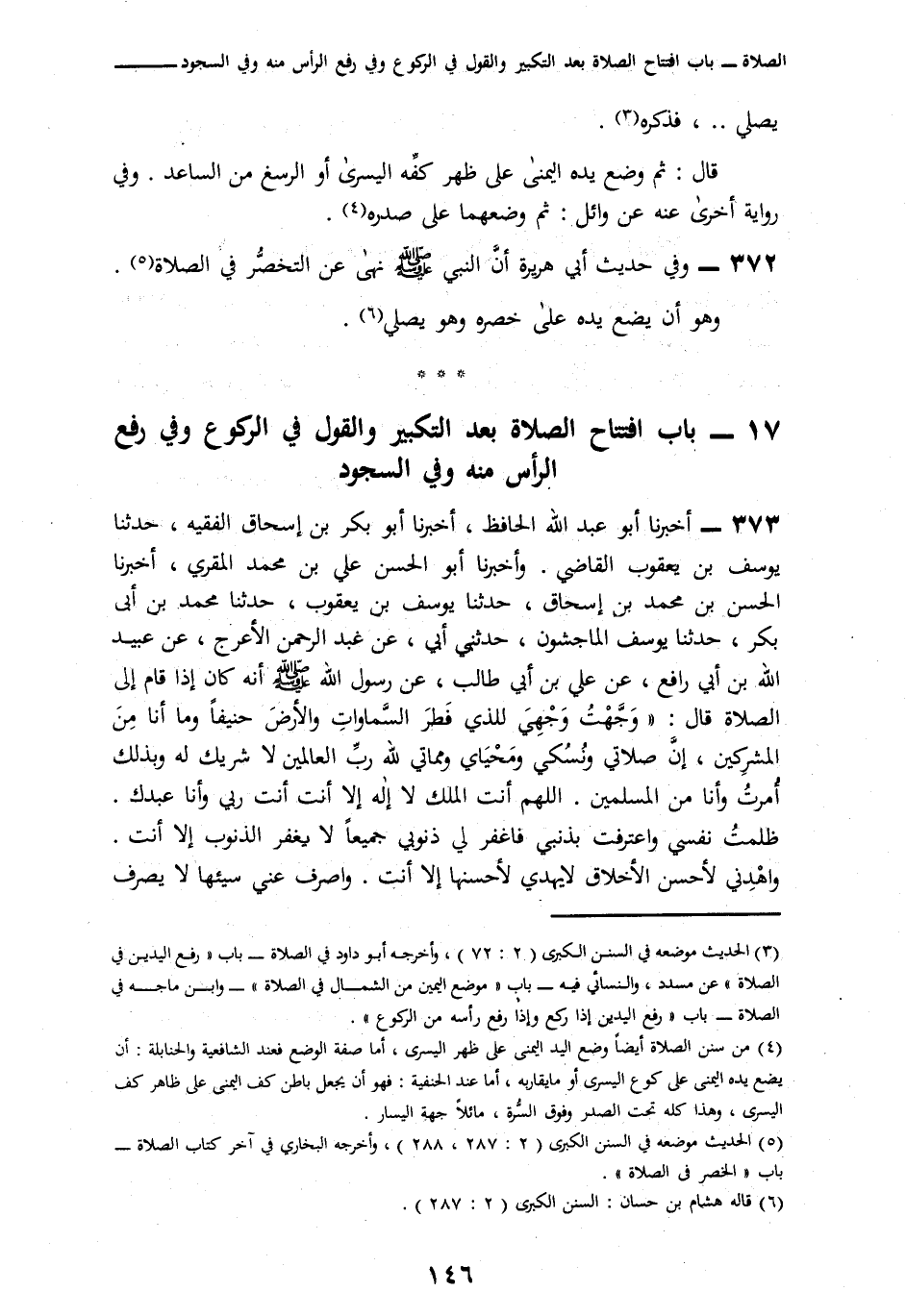 373 - أَخْبَرَنَا أَبُو عَبْدِ اللَّهِ الْحَافِظُ، أنا أَبُو بَكْرِ بْنُ إِسْحَاقَ الْفَقِيهُ، نا يُوسُفُ بْنُ يَعْقُوبَ الْقَاضِي، وَأَخْبَرَنَا أَبُو الْحَسَنِ عَلِيُّ بْنُ مُحَمَّدٍ الْمُقْرِئُ، أنا الْحَسَنُ بْنُ مُحَمَّدِ بْنِ إِسْحَاقَ، نا يُوسُفُ بْنُ يَعْقُوبَ، نا مُحَمَّدُ بْنُ أَبِي بَكْرٍ، نا يُوسُفُ الْمَاجِشُونُ، حَدَّثَنِي أَبِي، عَنْ عَبْدِ الرَّحْمَنِ الْأَعْرَجِ، عَنْ عُبَيْدِ اللَّهِ بْنِ أَبِي رَافِعٍ، عَنْ عَلِيِّ بْنِ أَبِي طَالِبٍ، عَنْ رَسُولِ اللَّهِ صَلَّى اللهُ عَلَيْهِ وَسَلَّمَ، أَنَّهُ كَانَ إِذَا قَامَ إِلَى الصَّلَاةِ قَالَ: «§وَجَّهْتُ وَجْهِي لِلَّذِي فَطَرَ السَّمَوَاتِ، وَالْأَرْضَ حَنِيفًا وَمَا أَنَا مِنَ الْمُشْرِكِينَ، إِنَّ صَلَاتِي وَنُسُكِي وَمَحْيَايَ وَمَمَاتِي لِلَّهِ رَبِّ الْعَالَمِينَ لَا شَرِيكَ لَهُ، وَبِذَلِكَ أُمِرْتُ وَأَنَا مِنَ الْمُسْلِمِينَ، اللَّهُمَّ أَنْتَ الْمَلِكُ لَا إِلَهَ إِلَّا أَنْتَ أَنْتَ رَبِّي، وَأَنَا عَبْدُكَ ظَلَمْتُ نَفْسِي، وَاعْتَرَفْتُ بِذَنْبِي فَاغْفِرْ لِي ذُنُوبِي جَمِيعًا لَا يَغْفِرُ الذُّنُوبَ إِلَّا أَنْتَ، وَاهْدِنِي لِأَحْسَنِ الْأَخْلَاقِ، وَلَا يَهْدِي لِأَحْسَنِهَا إِلَّا أَنْتَ، وَاصْرِفْ عَنِّي سَيِّئَهَا، وَلَا يَصْرِفُ -[145]- عَنْ سَيِّئَهَا إِلَّا أَنْتَ» وَفِي رِوَايَةِ الْمُقْرِئِ: «لَا يَصْرِفُ عَنِّي سَيِّئَهَا إِلَّا أَنْتَ لَبَّيْكَ وَسَعْدَيْكَ، وَالْخَيْرُ كُلُّهُ فِي يَدَيْكَ وَالشَّرُّ لَيْسَ إِلَيْكَ أَنَا بِكَ وَإِلَيْكَ تَبَارَكْتَ وَتَعَالَيْتَ أَسْتَغْفِرُكَ وَأَتُوبُ إِلَيْكَ» فَإِذَا رَكَعَ قَالَ: " اللَّهُمَّ لَكَ رَكَعْتُ وَبِكَ آمَنْتُ، وَلَكَ أَسْلَمْتُ خَشَعَ لَكَ سَمْعِي وَبَصَرِي، وَمُخِّي وَعِظَامِي، وَعَصَبِي فَإِذَا رَفَعَ رَأْسَهُ قَالَ: «اللَّهُمَّ رَبَّنَا لَكَ الْحَمْدُ مِلْءَ السَّمَوَاتِ وَالْأَرْضِ، وَمَا بَيْنَهُمَا وَمِلْءَ مَا شِئْتَ مِنْ شَيْءٍ بَعْدُ» فَإِذَا سَجَدَ قَالَ: «اللَّهُمَّ لَكَ سَجَدْتُ، وَبِكَ آمَنْتُ، وَلَكَ أَسْلَمْتُ سَجَدَ وَجْهِي لِلَّذِي خَلَقَهُ وَصَوَّرَهُ فَشَقَّ سَمْعَهُ وَبَصَرَهُ تَبَارَكَ اللَّهُ أَحْسَنُ الْخَالِقِينَ» ثُمَّ يَكُونُ آخِرُ مَا يَقُولُ بَيْنَ التَّشَهُّدِ وَالسَّلَامِ: «اللَّهُمَّ اغْفِرْ لِي مَا قَدَّمْتُ وَمَا أَخَّرْتُ وَمَا أَسْرَرْتُ وَمَا أَعْلَنْتُ وَمَا أَسْرَفْتُ، وَمَا أَنْتَ أَعْلَمُ بِهِ مِنِّي أَنْتَ الْمُقَدِّمُ وَأَنْتَ الْمُؤَخِّرُ لَا إِلَهَ إِلَّا أَنْتَ»