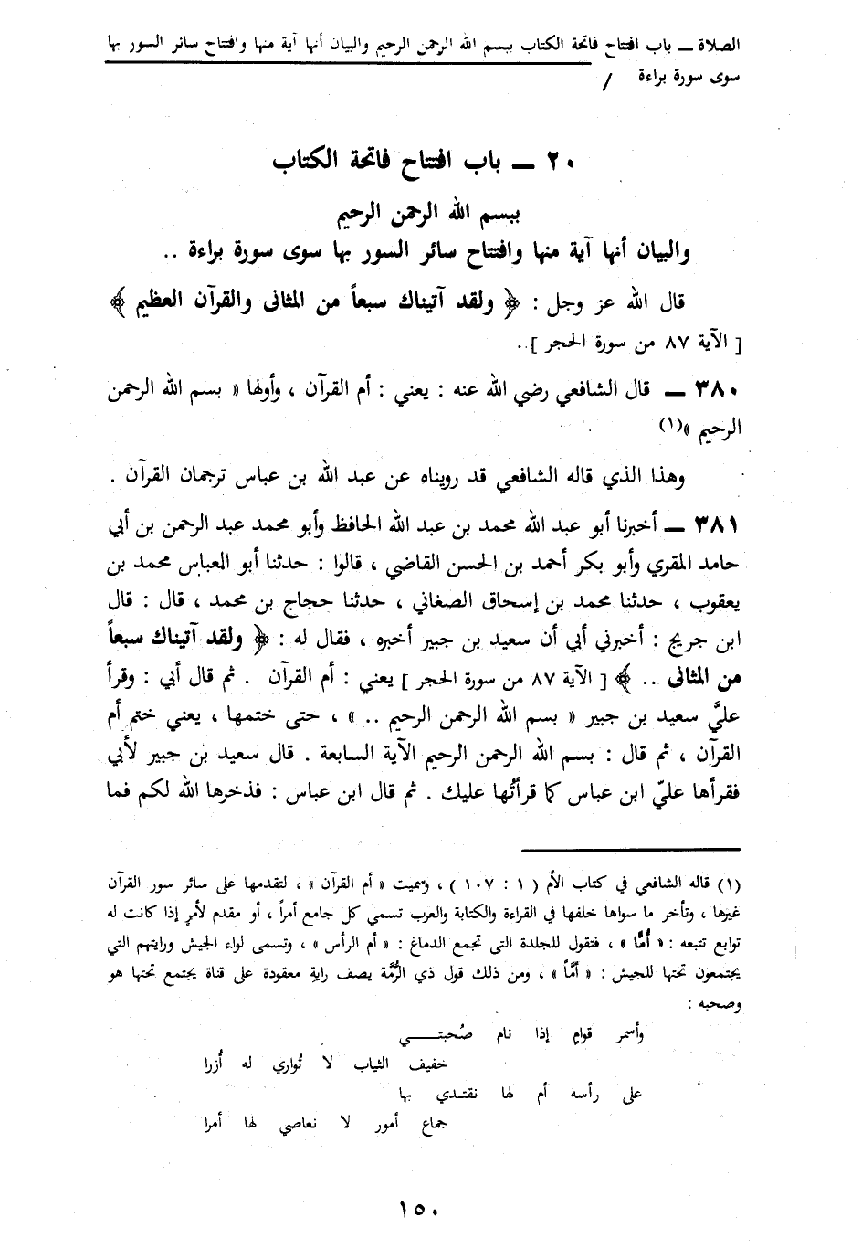 380 - قَالَ الشَّافِعِيُّ رَضِيَ اللَّهُ عَنْهُ: يَعْنِي أُمَّ الْقُرْآنِ وَأَوَّلُهَا: بِسْمِ اللَّهِ الرَّحْمَنِ الرَّحِيمِ وَهَذَا الَّذِي قَالَهُ الشَّافِعِيُّ قَدْ رُوِّينَاهُ عَنْ عَبْدِ اللَّهِ بْنِ عَبَّاسٍ، تُرْجُمَانِ الْقُرْآنِ