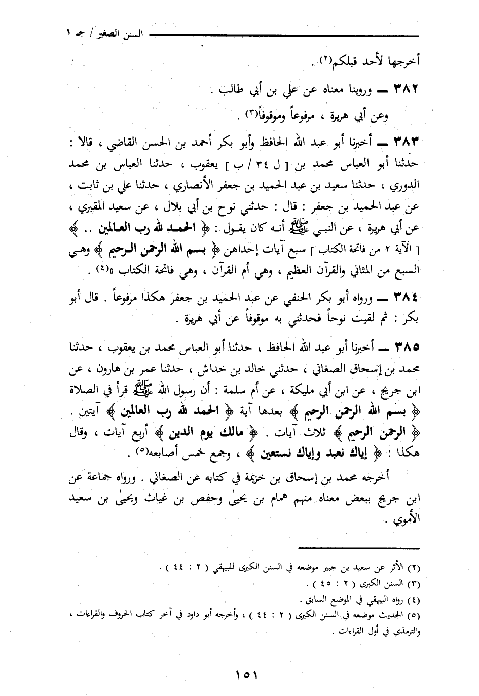 383 - أَخْبَرَنَا أَبُو عَبْدِ اللَّهِ الْحَافِظُ، وَأَبُو بَكْرٍ أَحْمَدُ بْنُ الْحَسَنِ الْقَاضِي قَالَا: نا أَبُو الْعَبَّاسِ مُحَمَّدُ بْنُ يَعْقُوبَ، نا الْعَبَّاسُ بْنُ مُحَمَّدٍ الدُّورِيُّ، نا سَعِيدُ بْنُ عَبْدِ الْحَمِيدِ بْنِ جَعْفَرٍ الْأَنْصَارِيُّ، نا عَلِيُّ بْنُ ثَابِتٍ، عَنْ عَبْدِ الْحَمِيدِ بْنِ جَعْفَرٍ، قَالَ: حَدَّثَنِي نُوحُ بْنُ أَبِي بِلَالٍ، عَنْ سَعِيدٍ الْمَقْبُرِيِّ، عَنْ أَبِي هُرَيْرَةَ، عَنِ النَّبِيِّ صَلَّى اللهُ عَلَيْهِ وَسَلَّمَ أَنَّهُ كَانَ يَقُولُ: " {§الْحَمْدُ لِلَّهِ رَبِّ الْعَالَمِينَ} [الفاتحة: 2] سَبْعُ آيَاتٍ إِحْدَاهُنَّ {بِسْمِ اللَّهِ الرَّحْمَنِ الرَّحِيمِ} [الفاتحة: 1] وَهِيَ السَّبْعُ الْمَثَانِي وَالْقِرَانُ الْعَظِيمُ، وَهِيَ أُمُّ الْقُرْآنِ وَهِيَ فَاتِحَةُ الْكِتَابِ "